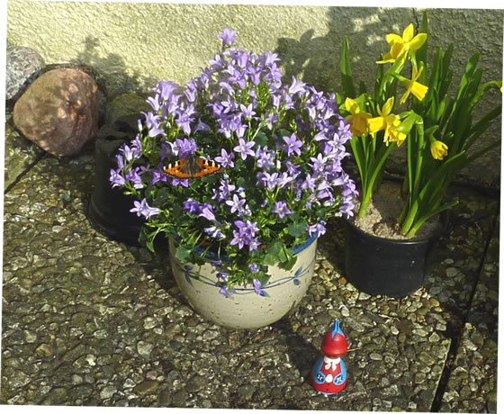 Up de Terrass stünn en Putt mit Glockenbloom in de Sünn. De harr Besöök vun enen Bottervagel, enen lütten Voss. Aver bald flöög he wieder un sett sik up en Viölchen vun de Blomenampel.