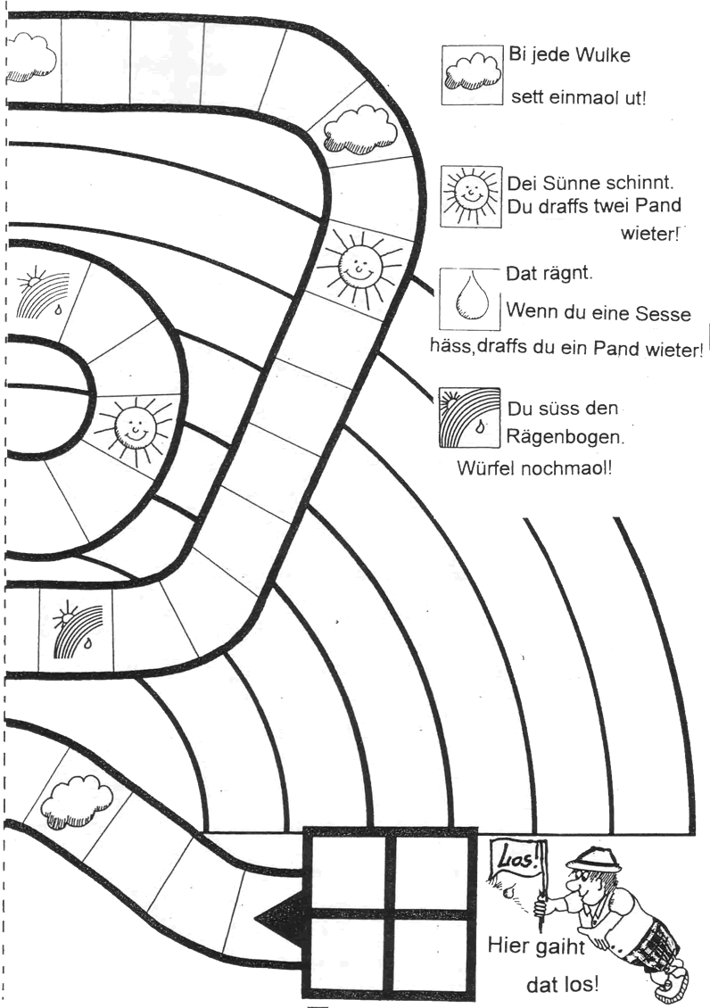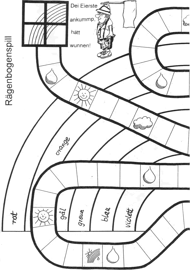 1. Kläw dei beiden Blör tauhoope! 2. Maol den Rägenbogen mit Buntstifte an! Denn gaiht dat los mit Wörpeln: