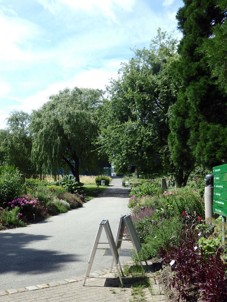Dat heet jo, Eva hett den Appel vun den Baum der Erkenntnis afplückt, aver de Fru vun de Gesellschaft der FreundInnen des Botanischen Gartens hett mi vertellt, dat weer en falsche Översetten in de Bibel, meent weer de Affall Gottes. De Hamborger Pädagogin Hannelore Loki Schmidt (born 1919 in Hamborg und dor uk 2010 storven), de later mit den Altkanzler Helmut Schmidt verheirat weer, harr en Liedenschop för Biologie un weer bannig aktiv as Botanikerin, Natuur- un Plantenschützerin. (Quelle Wikipedia) Siet de 1970er Johren hett se sik för den Botanischen Goorn insett, dat heet, för de Erforschung un Erhaltung biologischer Vielfalt. Ehr to Ehren hett de düütsche Künstler Manfred Sihle-Wissel (born 1934 in Tallin/Estland) 2005 en Büste ut Bronze vun Loki Schmidt maakt. De steiht in den Loki-Schmidt-Goorn 'n Stück wieder achter den Hauptingang Ohnhorststraat (S-Bahn S1, Station Klein Flottbek, Buslinien 21 un 15).