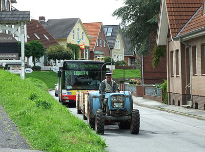 Dat heet, de ingelsch Physiker, Natuurforscher un Verwaltungsbeamte Sir Isaac Newton (born 1643 storven 1727) hett mol ünner en Appelboom seten, un as een Appel rünnerfull, hett Newton dat Gesetz vun de Schwerkraft entdeckt. Hett Newton man blots fuul to'n Entspannen ünnern Boom seten or wull he weten, worüm de Appel daalfallt? Dat mutt in'n Maand August or September west ween. Op jeden Fall bi uns in'n Norden vun Düütschland beginnt in August in't Ole Land dat Oornen vun de fröhen Sorten vun de Appels un in September denn vun de Sorten, de inlagert ward. Hier kannst mehr doröver lesen. Düssen Buurn heff ik 2011 fotografeert, as he mit luud Knattern dörch de Straten in den Hamborger Stadtdeel Cranz langdüüst weer, achtern op kistenwies Appels, un ik heff dacht: Glieks röppt he: Frische Appels, frische Appels ...