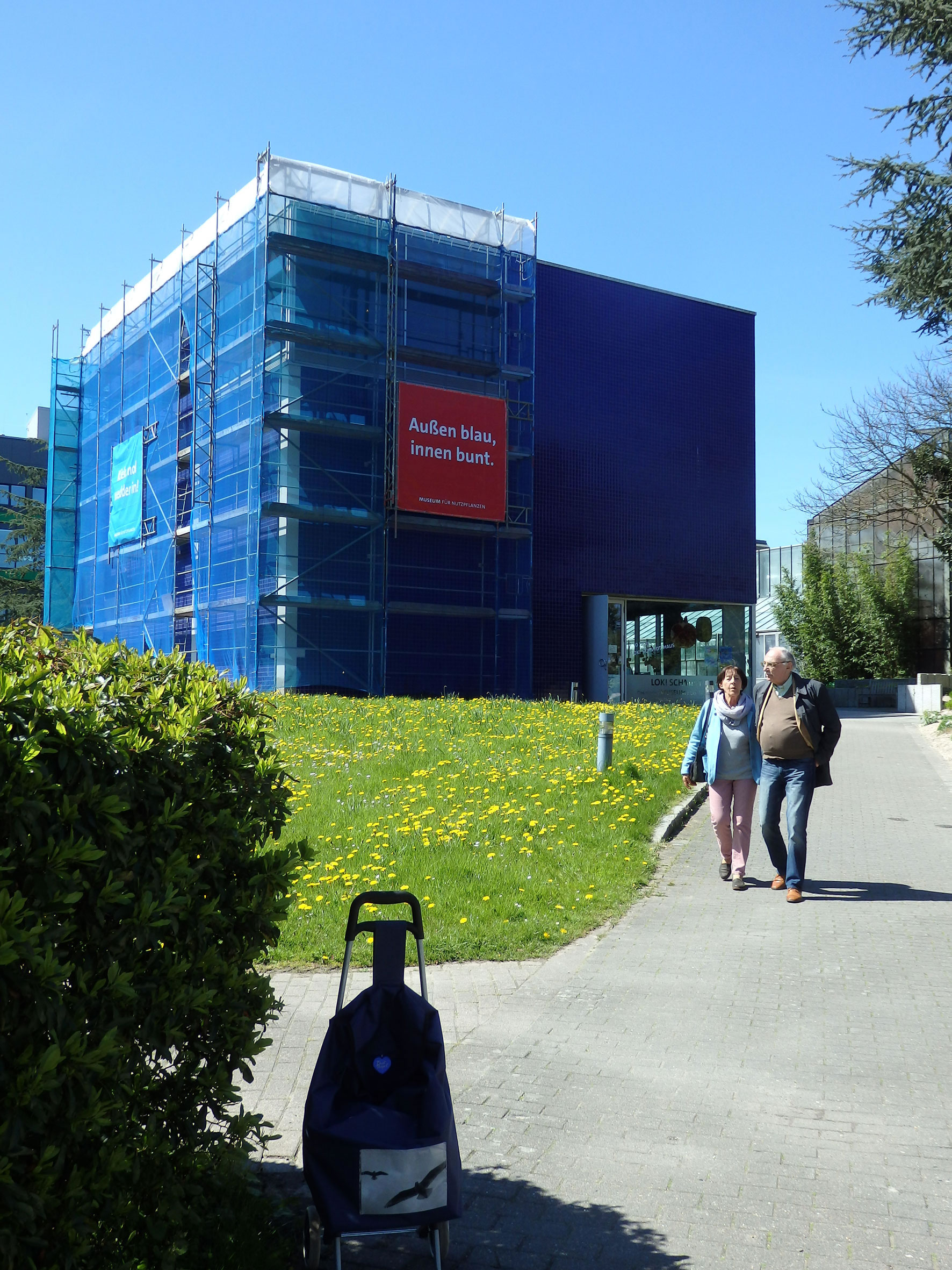 Man dat gifft nich blots de Büste vun ehr, sünnern vun den Hauptingang, an de Büste vörbi, den Weg beten na links, steiht dat Loki-Schmidt-Huus. Dat blaue Huus is op dat Foto hier links achter'n Boom 'n beten to sehn. Lokis Kopp an de rechte Siet süht in Richtung na "ehr" Huus. Dat Loki-Schmidt-Huus is dat eenzige Nutzpflanzenmuseum in Düütschland un fiert jüst den 10. Geboortsdag.