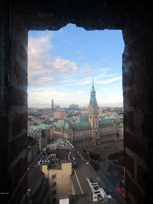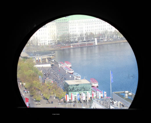 Finster en Stohl, un du hest en grootaardigen Blick op Hamborg. En Disch