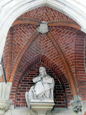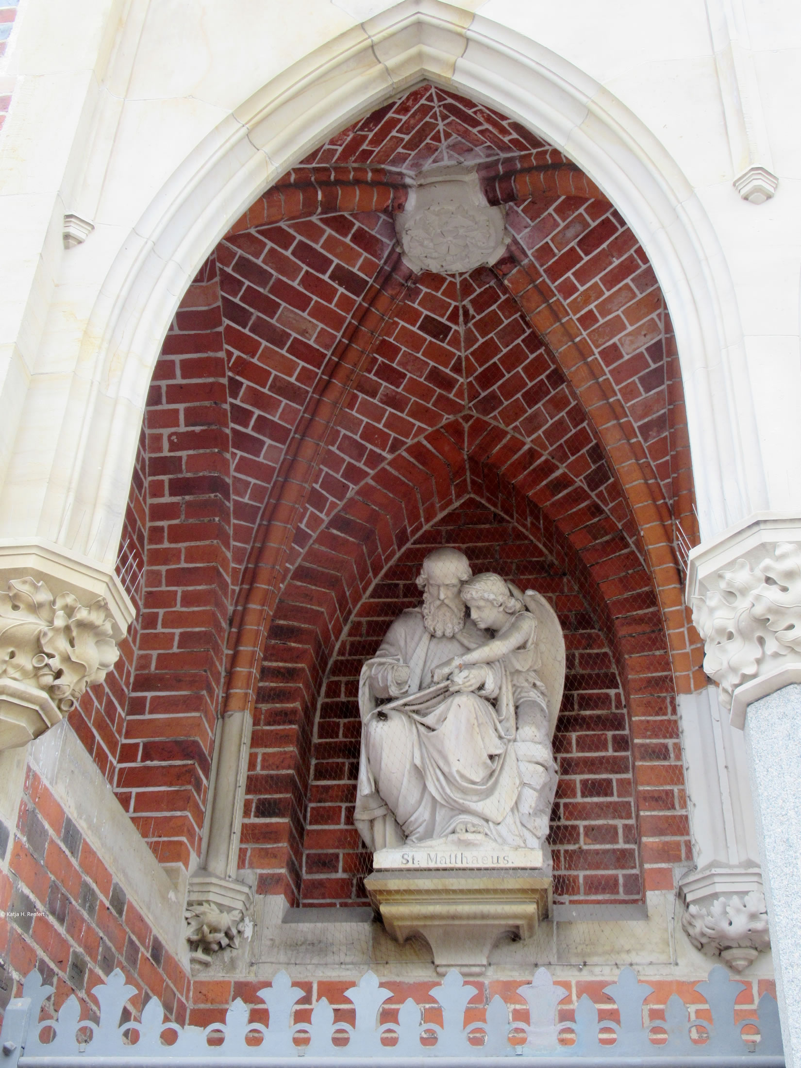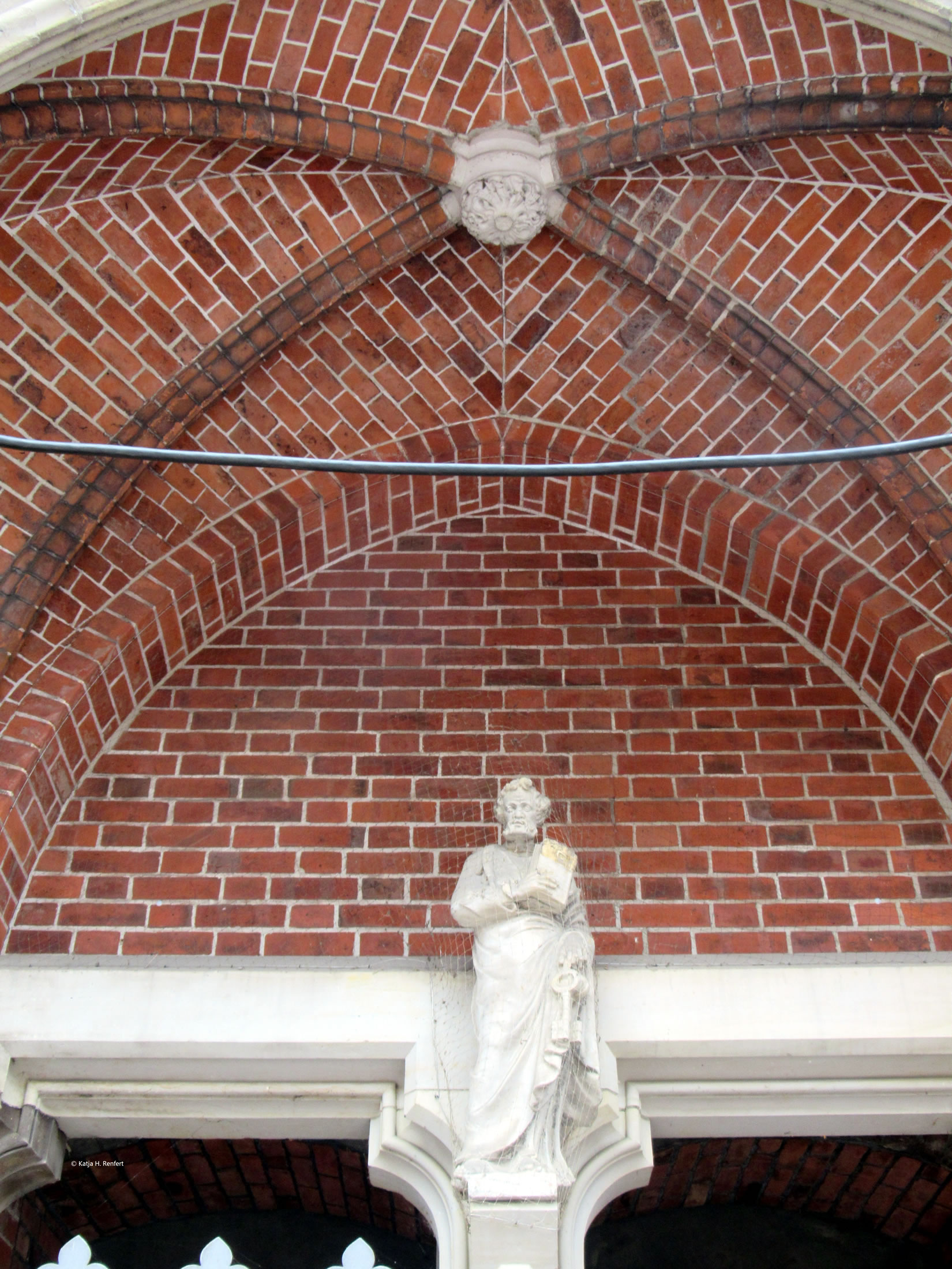 Vörn, över de Döör vun de Kark, sünd Jesus un twee Engels. Petrus un Paulus an de Westsiet. De hett he mit den Bildhauer Carl Fr. Neubert tosamen maakt. Vun den heff ik keen Infos funnen.