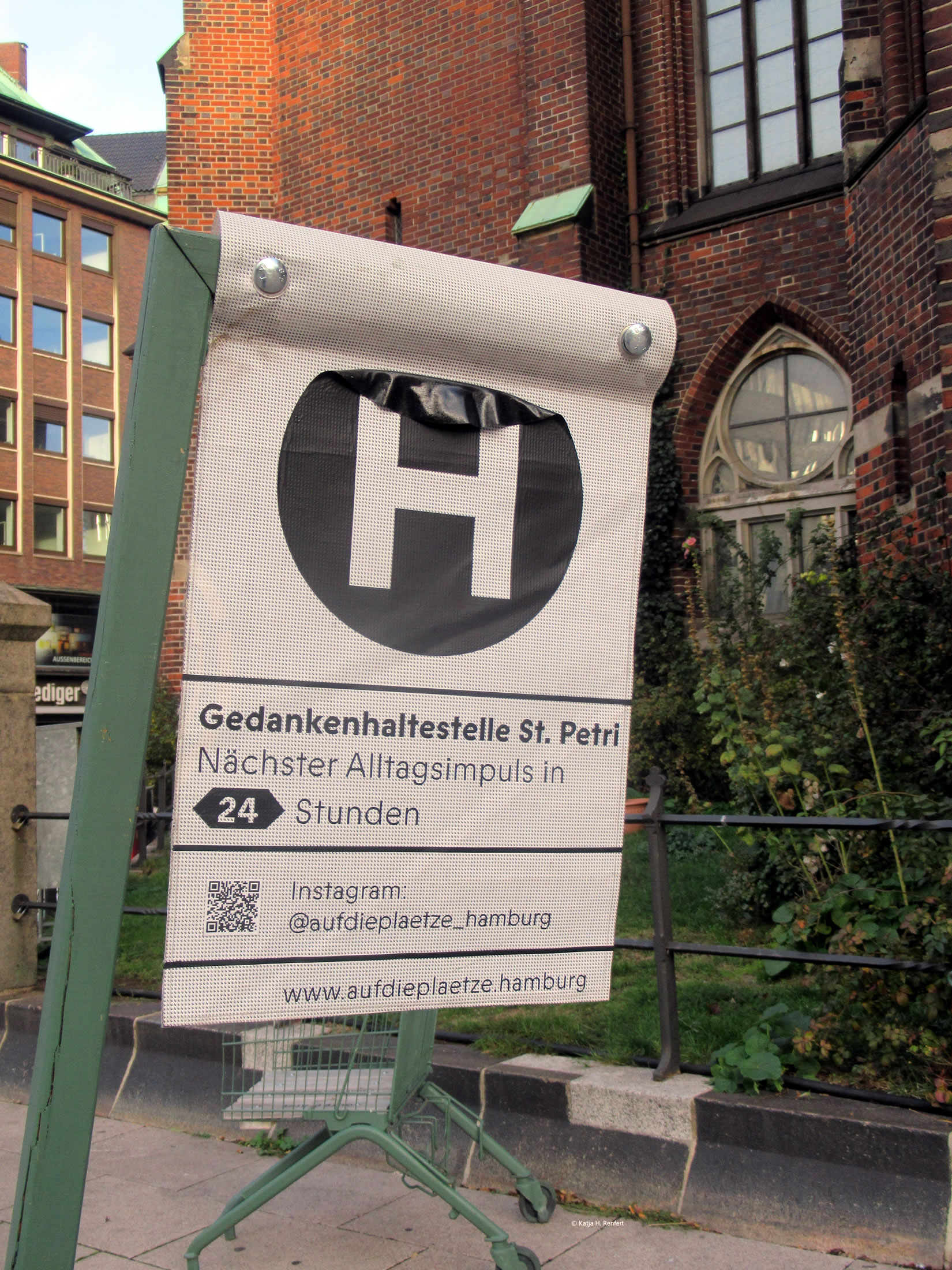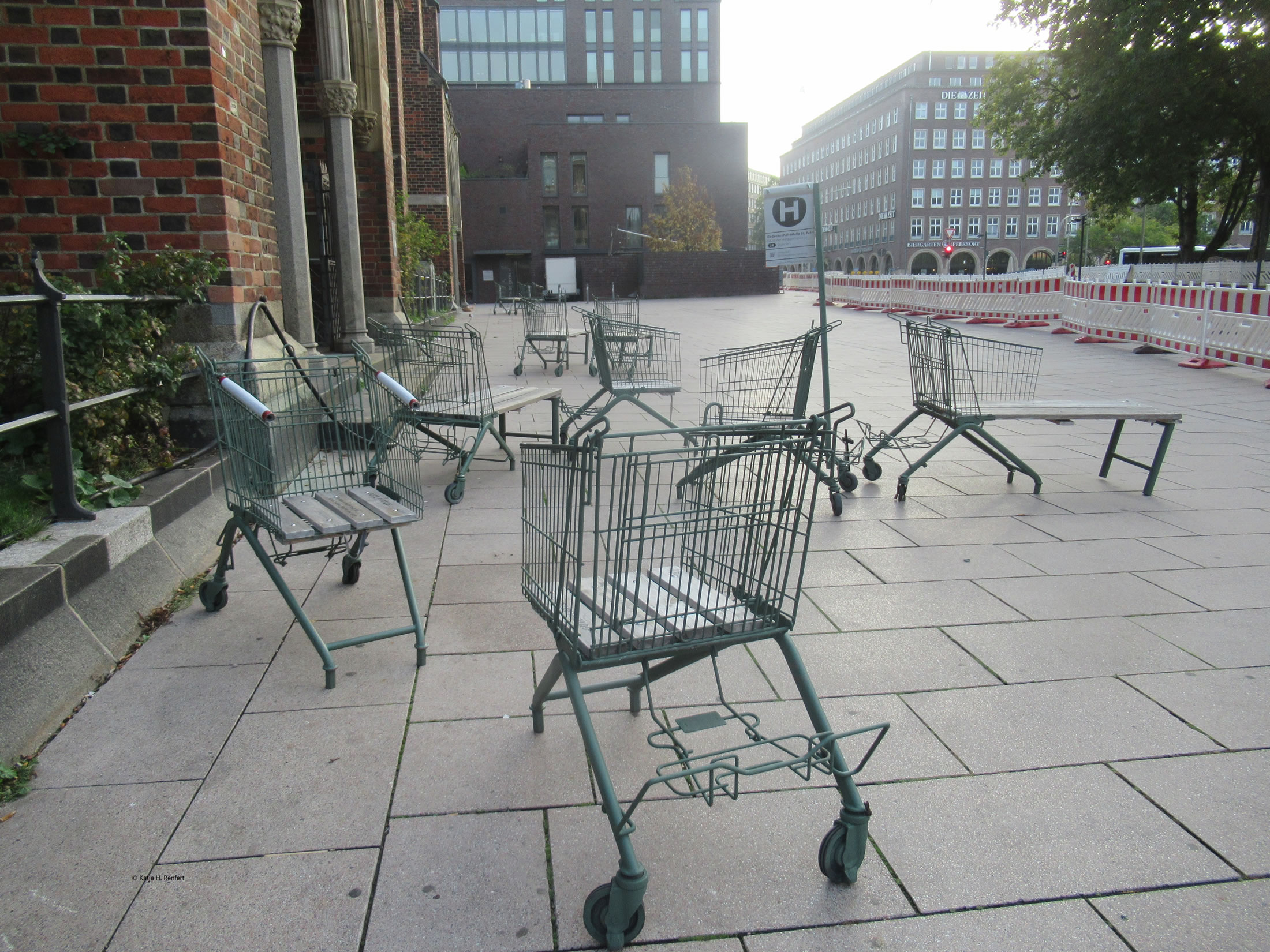 Denn weer ik bannig verbaast, worüm de velen Inköpswagen op den Platz stunnen. Dat Schild "Auf die Plätze" hett mi schlau maakt. Aver as ik vör poor Daag wedder an de Kark weer: keen eenzigen Wagen mehr. Ik heff an dat Karken-Büro schreven un de Info kreegen: dat is jümmers en "Sommer-Projekt". Dat fangt Enn Mai/Anfang Juni an, ahn en vörher fasten Termin. Üm de Wagens op den Platz optostellen, bruukt se jümmers de Verlööf vun de Stadt Hamborg. Eerst wenn se de hebben, köönt se denn ehr Projekt wedder starten.
