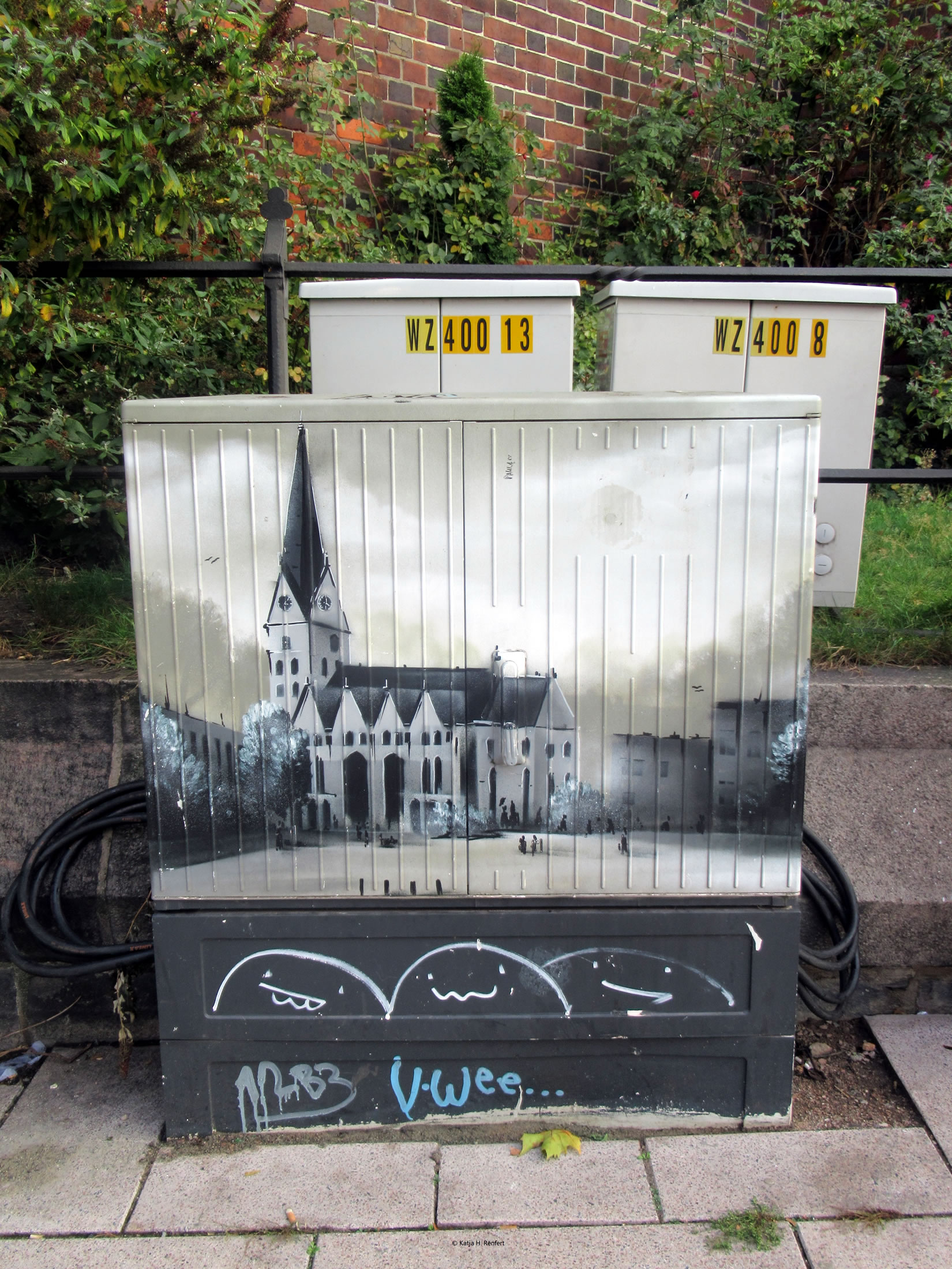 Trüch kaamt Se denn mit den Zurück-Knoop op de Browser-Symboolliest. Nadem ik binnen in'n Turm baben weer un denn wedder ut de Kark keem, bün ik 'n Stück wieder weg gahn un heff den Turm fotografeert, mit de Bullogen. Vörher heff ik gar nich wusst, dat man dor baben rutkieken kann un dat wohrschienlich jüst Lüüd ut een vun de Finstern na buten op en Deel vun Hamborg keeken. Graad, ut welkes Bulloog se in den runden Turm kiekt. An alle veer Sieden is en Klock an'n Turm. Dorna bün ik rechts an de Kark rüm gungen. Dor is de St.Petri-Kark op en Stroomkasten opmaalt. Dat hett de Künstler Vincent Schulz maakt. He is 1984 as Söhn vun en Künstler-Familie in Hamborg op de Welt kamen, 2004 hett he sien Fach-Abitur in'n Beriek Gestaltung un Design maakt, 2005 Studium an de Kunstschool Alsterdamm. Sietdat is he frieschaffender Künstler.
