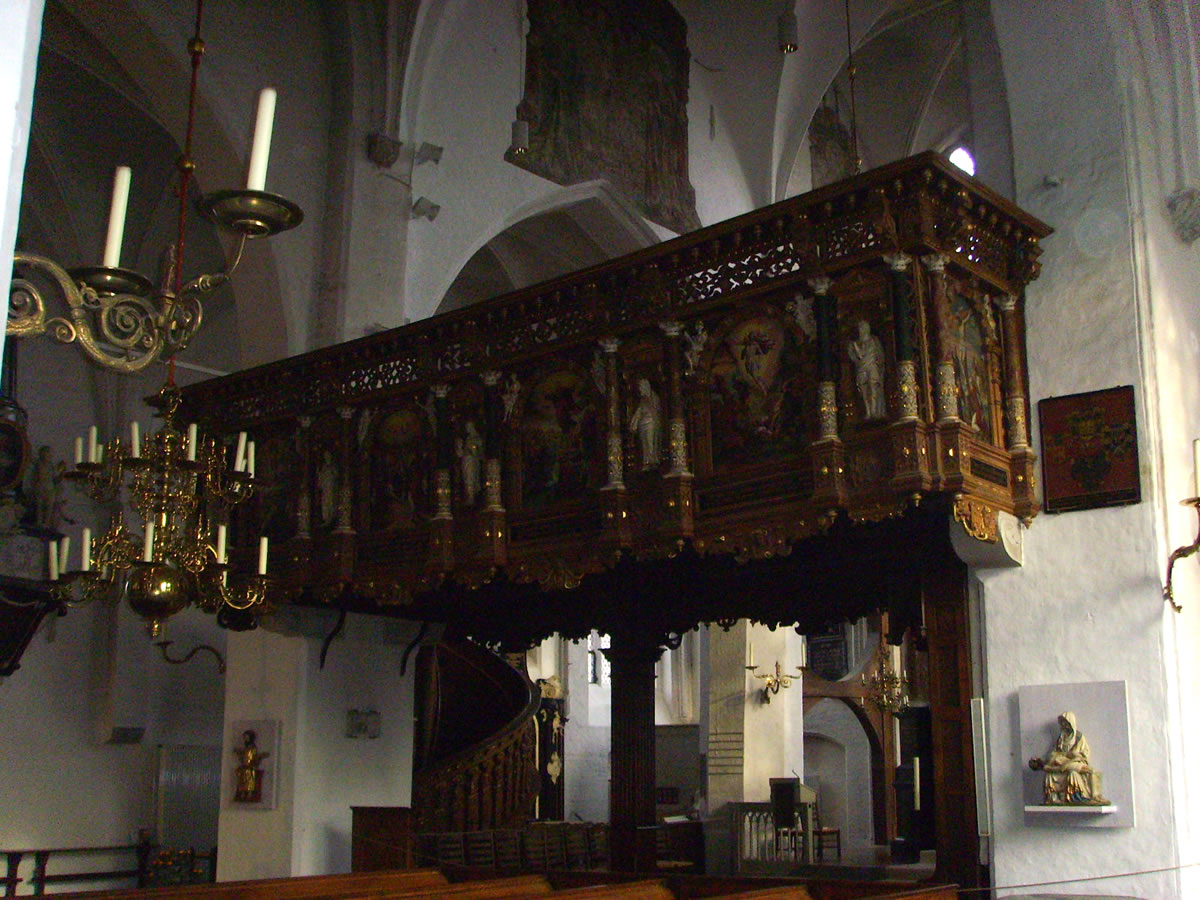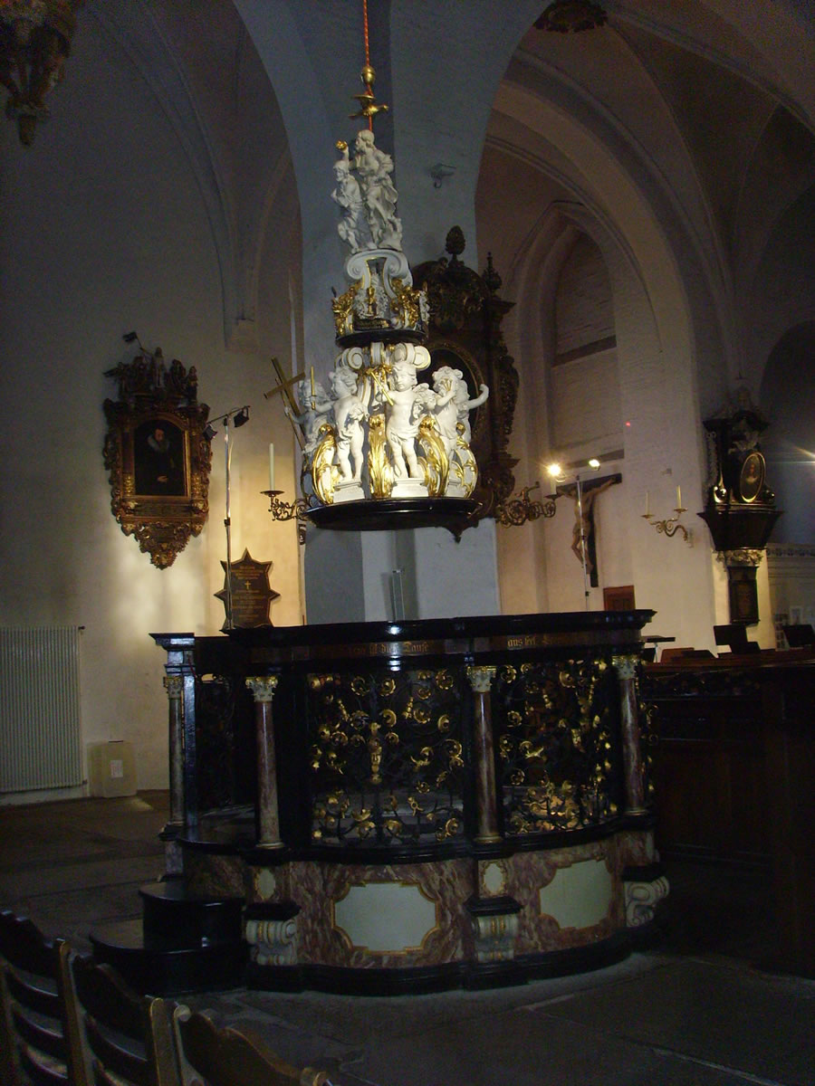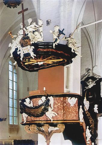 De Kanzel is so as de Orgel ut de Barocktiet. Dat Geld dorto keem ut