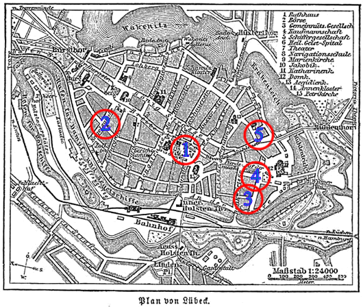 Verlopen kann en sik nich in Lübeck. Düsse Plan kenntekent, wo langs uns Padd dör Lübeck uns föhrt. De Links bi de Biller föhrt Se na de enkelten Bidrääg, 'neem de Buwarken vörstellt warrt.