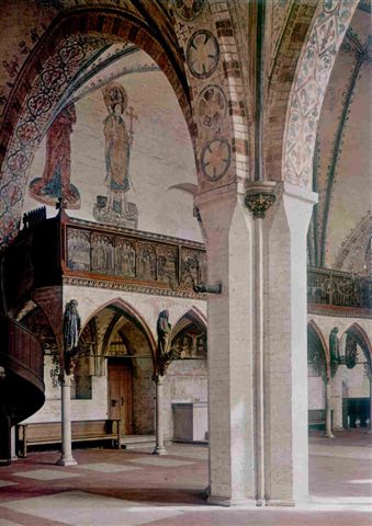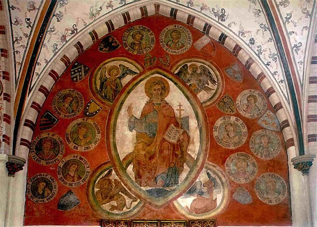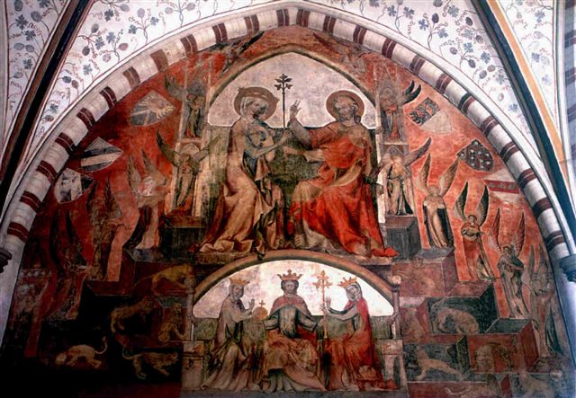 An de linke Wand is olle Malerie. Dat ene is en Marienkrönung.