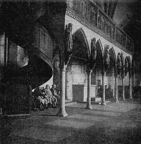 An de Wand graadto steiht de Lettner. Fief Bagens up slanke Pielers