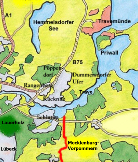 Up den Weg na't Stülper Huk kaamt wi dörch Dummersdörp, dat höört ok to Kücknitz. Vun dat Dörp is nich veel to sehn, avers dat Dummersdörper Över, "das Dummersdorfer Ufer"! Dat is wunnerschöön. Hooch över de Trav! Naturschutzgebiet! En Verein kümmert sik üm dat Gelände. Schaap hollt dat Kruut kort, so köönt de "Nickende Diestel" un de "Baltische Enzian" beter wassen. Nu sünd dat avers nich noog Schaap. Wenn Se möögt, denn so köönt Se Pate warrn för en Schaap. Is dat nix? Schaaps-Paat? Un nu föhrt wi trüch in dat "Zentrum"vun Kücknitz.