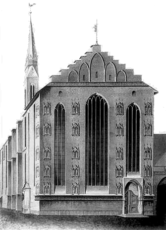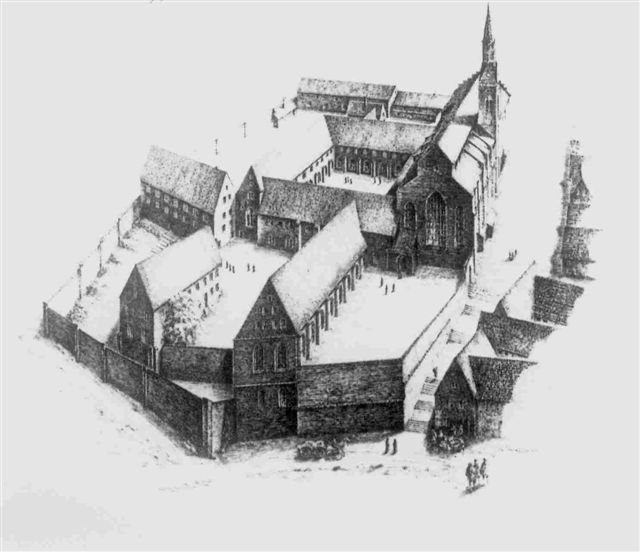 ehre Stadt verdreven hebbt. Dat hett unsen Herrgott gefullen. De Hillige Maria Magdalena sweev mit eens an'n Himmel, se hett ehren Mantel wiet utbreedt un dor de Sünnenstrahlen mit ümlenkt, de Dänen graad in de Oogen. De kunnen nix mehr sehn. De Lübecker mit ehre Frünnen kregen de Bavenhand, de däänsche König mit sien Heer is utneiht. Nu sün 1229 sünd Dominikaner-Mönke henkamen. Seker weer dor nich glieks en fardig Klooster, toeerst sünd de Mönke introcken in de Buwarken vun de olle Borg. In so en Stadt weren de mehrsten Hüüs ut Holt buut, so ok de Borg. Holt brennt licht, jümmers wedder hett dat grote Stadtbrände geven, un bi so en Füür is en groot Deel vun't Klooster afbrennt. Nableven is de "lange Hall", de is meist 40 Meter lang. Na dissen Brand is denn mit Backsteen nie buut worrn. De Kirch is inweiht. Üm den lütten Innenhoff leep de Krüüzgang mit ganz schöne gotische Gewöölv. De Kapitelsaal keem dorto, dat Hospital, dat Bichtthuus un allens, wat noch to en Klooster tohöört.