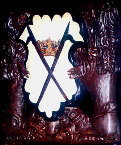 twee Bootshaken över Krüüz mit en Kroon. Vun hier köönt