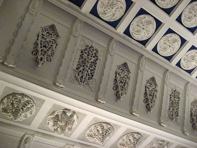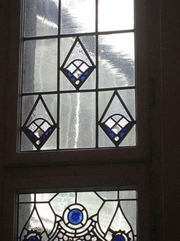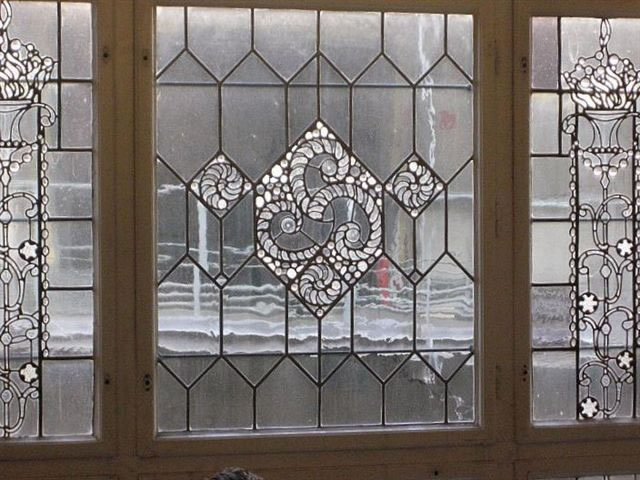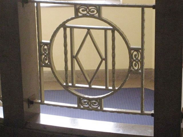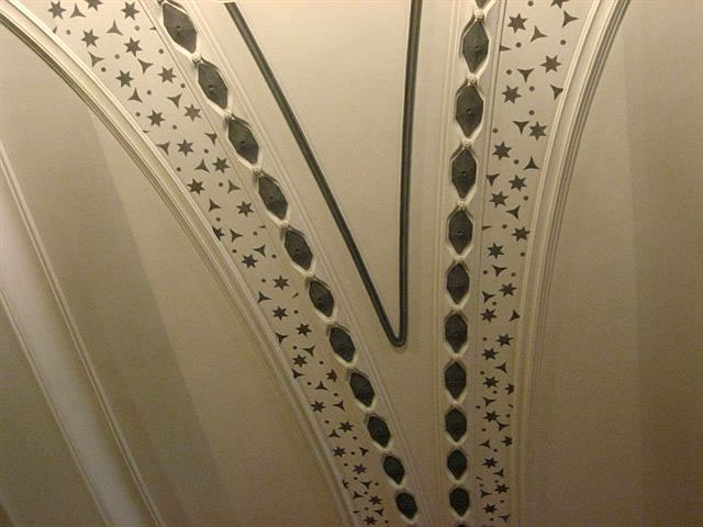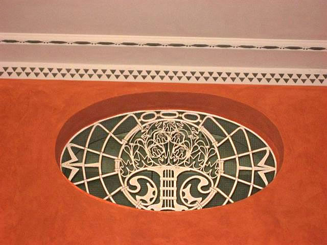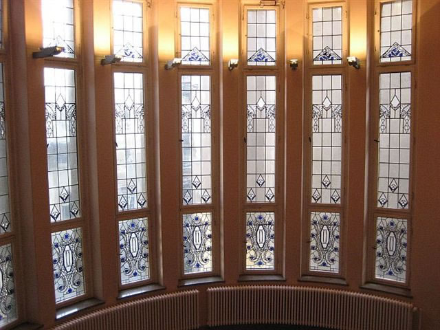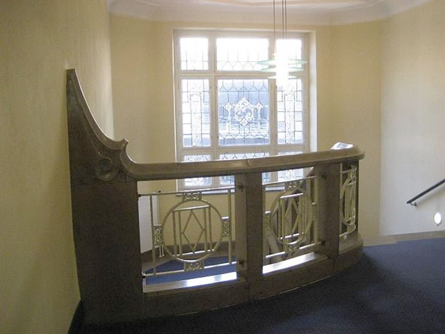 mit veel Jugendstil, mit Treppen un Finster un Ranken an de Deck un