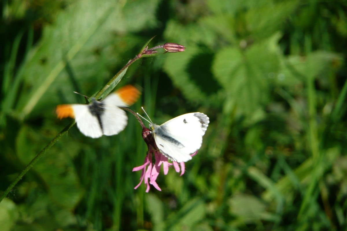 Dor kreeg ik mit, dat up de Bloom en witten Bottervagel seet. Seker weer dat en Fru. Ganz vörsichtig sliker ik mi dörch de Brennetteln un dat Unkruut dichter an de Bloom mit den witten Bottervagel. Nu kunn ik utmaken, wi se den slanken Achterliev wiet na baben böög. Se seet ganz still un harr ehr Flünken wiet utbreedt. Se tööv richtig up ehren Partner. De versöch ümmer wedder to lannen. Aver dat wull un wull nich klappen. Ik waag kuum Luft to halen. Dat hett tominnst teihn Minuten duurt, bit he endlich richtig landt is.