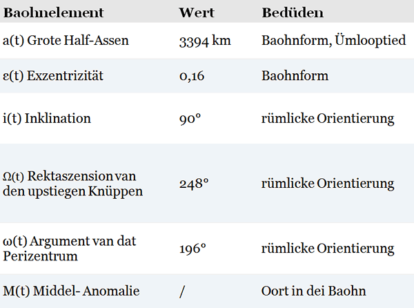dei +Z-Assen) van dei MÜS (Inklination = 90°). Dei Ümloop För dei MÜS is ein Polar-Ümloop (Flüg äöwer dei Merkur-Pole) dei schall eine Ellipsen-Form häbben plaont. Dei Ümloop van Ruumsonden werd meist in Form van dei Keplerschken Baohnelemente angäben. In dei Tabelle neern finnt man dei. In dat Bild "Baohnelemente" werd dei Ruumlaoge dör dei Baohnprameter at Skizze nauer verklort. Dei neumten Baohnelemente ännert sick mit dei Tied (f(t)) dör eine Riege Störungen: Gravitationspotential van den Merkur (Affwieken van eine ideaole Kugel mit sphärischk symmetrischke Massenverdeilung; tau'n Bispill dör Affplatten, Leegten, Barge, verschiedene Dichte), Gravitationspotential van annere naohe Himmelsobjekte (t. B. Sünne) un dei solare Straohlendruck (Photonen, dei ehren Impuls an dat Ruumschipp äöwerdräget). Eine annere Störgrötte, besünners för deip fleigen Satelliten, is eine affnähmen Geschwinnigkeit dör dei Riewung mit eine Atmosphäre. Bi den Merkur aohne Atmoshäre hät dit kien Bedüden.