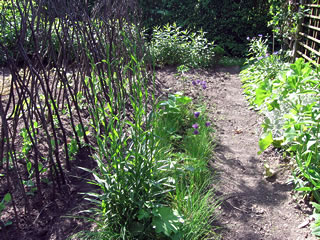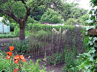 Tweeunhalf Meter lange Holtstangen hett he buut un in de Eerd steken, so üm de twintig bit fiefuntwintig Zentimeter deep hett he se inbuddelt, jümmer twee Stangen gegenöver stellt un de Tippen krüüzt, boven is een Stang röverleggt, so hett dat noch mehr Fastigkeit. Ik find, dat süht so idyllisch ut, so harr dat mien Grootvoder ok mookt.