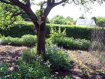 De nostalgische Harke lehnt an den olen Appelboom, rechterhand Arven
