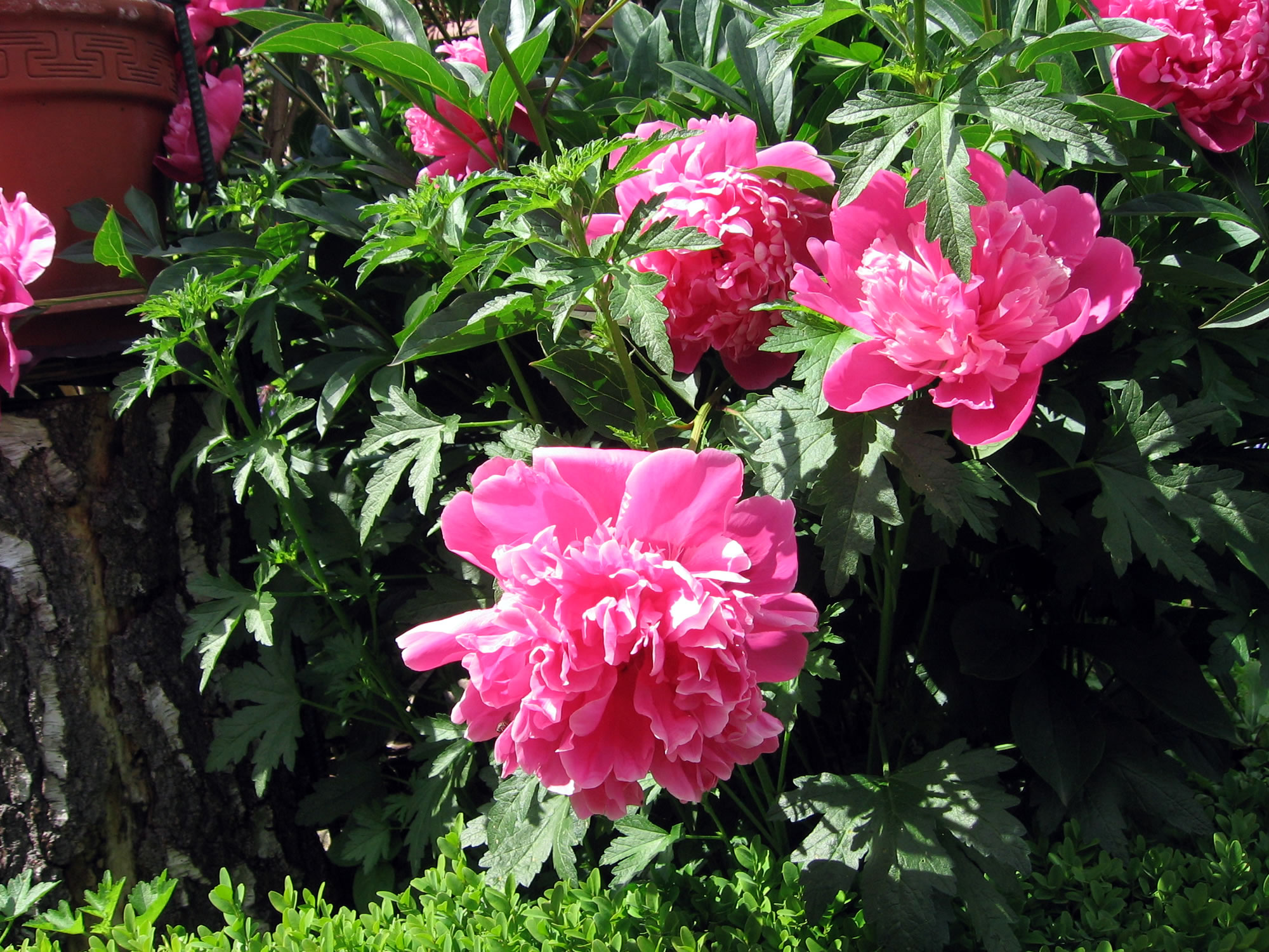 Ik freu mi ok över uns Buernrosen, de düt Johr ganz besünners scheun sünd, se hebbt grote vull wussen Bleuten, un se rükt so wunnerbor. Wi hebbt se mit rosaroot un zoort witt Bleuten. Se sünd ole un eddel Planten un warrn een bit twee Meter hooch mit greune Bläder, süht ut as en Busch, un se sünd winterhart.