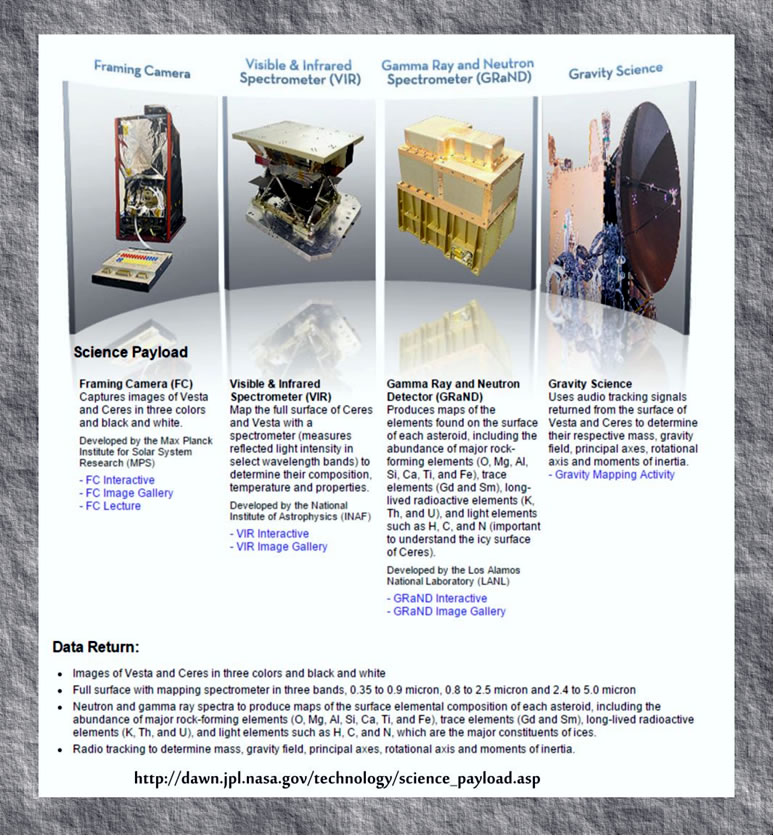 Stellt Korten van dei funnen Elemente up den Bodden van jeden Asteroid her, mit inschlaoten dat Upträen van dei wichtigen Steinbildungselemente (O, Mg, Al, Si, Ti un Fe), un dei Spauerelemente (Gd un Sm), dei langläben radioaktiven Elemente (K, Th un U) un dei lichteren Elemente as H, C un N (wichtig för dei Künne äöwer den iesigen Bodden van Ceres). Ünner disse Links finnt man noch mehr (up englischk): Gravitationsforschkung Warket mit upnaohmen Audio-Signaole, dei trüggekaomt van den Bodden van Vesta un Ceres. (Audio heit hier: Feldsignaole werd as Tonsignaole affspält.) Dormit bestimmt man ehre Masse, dat Gravitionsfeld, dei Hauptassen, dei Rotationsassen un dei Trägheitsmomente. Ünner disse Links finnt man noch mehr (up englischk): Text nao: Nasa-Vörlaogen
