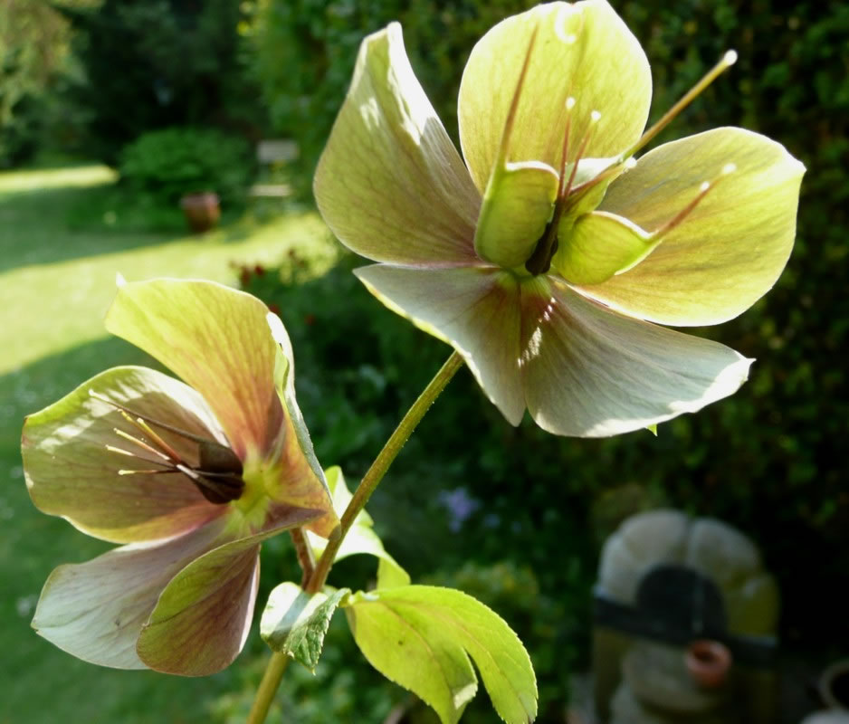 Na'n poor Daag harrn de beiden Bloom al ehr Blöden upmaakt. Se weern al so groot, dat en lütt Deern de roden un witten Blöden wies wöör. Se wull glieks welk plücken. Dat harr ehr Modder ut dat Kökenfinster mitkregen. Mit Sorg in de Stimm reep se: "Nich mit de nakelten Hannen anfaten, de Bloom sünd bannig giftig!" "Ok de witten Bloom?" fraag de lütt Deern, "dat sünd doch Christrosen!"