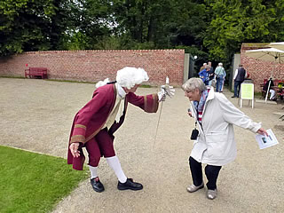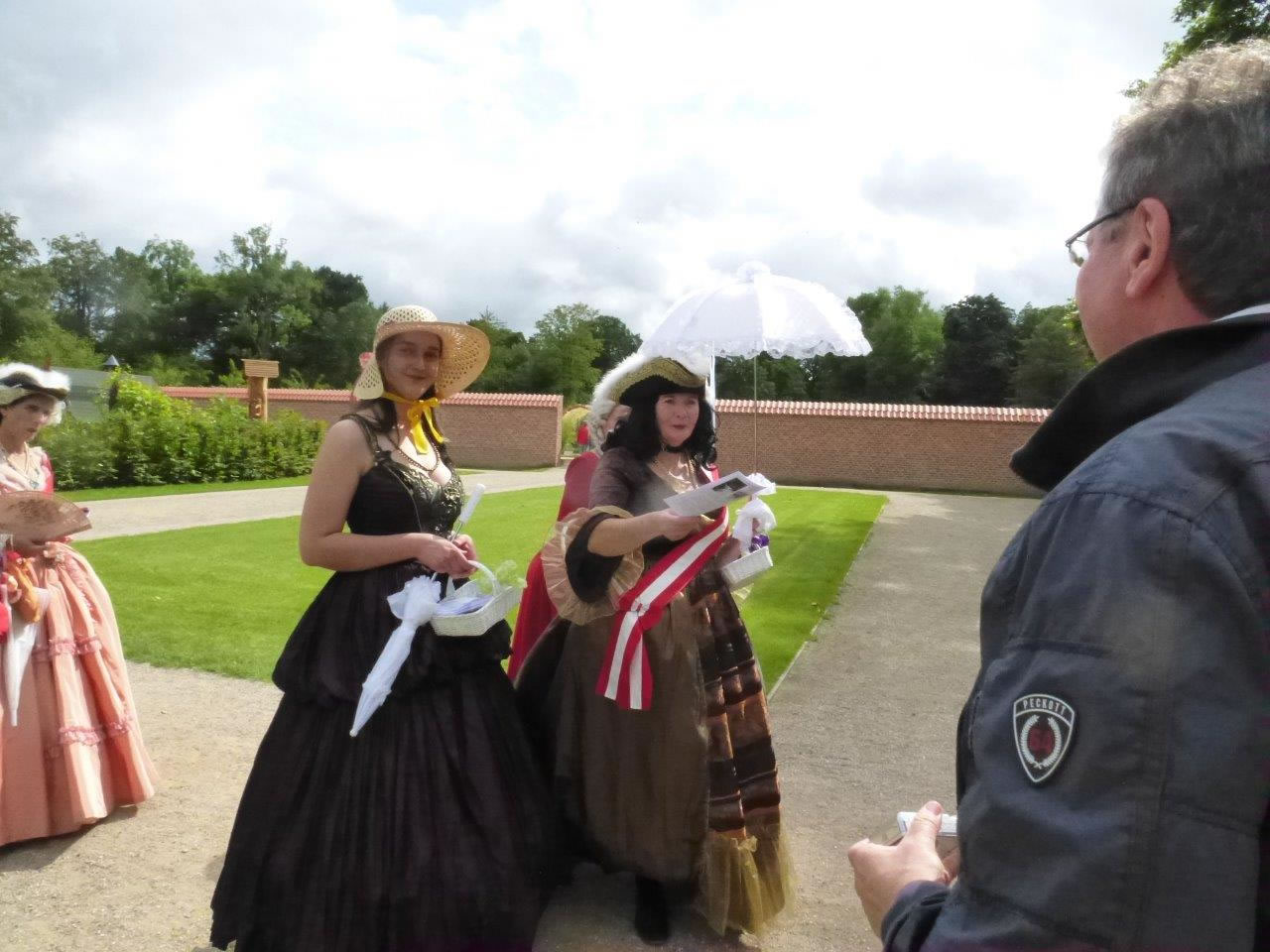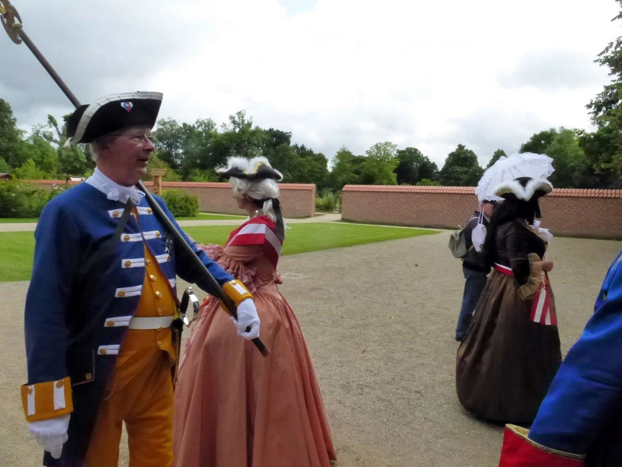 De Sünn stunn hooch, aver ok de Wulken weern dor, un de sehn mächtig swatt ut. Noch hölln se sik aver torüch. Wi geneten uns Koffi un höpen dat Beste. As wi Kaffee un Koken achter uns schall heten: binnen uns harrn, kemen dor mit'n maal poor Minschen mit Puderperücken un Reifrock de ganze adelige Schloss-Sellschap keem vörbi, mit Sünnenschirm un Pompadour. Sogoor en Schloss-Soldaat mit Hellebarde un Dreespitz!