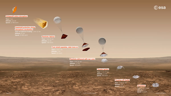 Dorbi probeiert man as Vörsorge för taukaomen Missionen eine Riege van Technologien ut, dei för ein kontrolleiertet Affstiegen un Landen up den Mars nödig sünd, so ein Hitteschild, Fallscherm, Andriew-System un eine quetschbore Hüllenkonstruktion. Schiaparelli hätt uck ein lüttket Wätenschkup-Paket bi sick, dat Windgeschwinnigkeiten, Feuchtigkeit, Druck un Temperatur an den Landeplatz upnimmp. Doräöwer weg werd dat Modul dei eiersten Mätdaoten tau Elektromagnetischke Felder up den Marsbodden faoten, dei vellicht Informationen äöwer dei Start-Ursaoke van dei Sandstürme gäwen käönt. Van dat Afftrennen van Schiaparelli van dat TGO an den 16. Oktober geef et ein Online-Äöwerdrägen för Medien ut aale Welt. Tausaome mit den ESA-Generaoldirektor Jan Wörner, den Astronaut Alexander Gerst un den Experten för disse Mission bi dei ESA/ESOC löp dat Beobachten van den Intritt van dat TGO in den Ümloop un uck van dei Landung van Schiaparelli. Dortau giff et an'n 20. Oktober eine Pressekonferenz. Denn wätet wi, dat dei Sonde up'n Mars off in'n Mors is. ExoMars-Signaole wiest den stabilen Marsümloop van dat TGO an Dei Signaole van dat TGO kennt man an dei hogen Spitzen. Doran käönt dei Forschkers seihn, dat disse Sonde pass un stabil in den Marsümloop ankaomen is un den Landeapparaot (Schiaparelli) affsetten dö. Dei üm den Mars fleigen Satelliten mäötet noch dei Signaole van Schiaparelli äöwernähmen un nao dei Eern wiederleiten. Solange weit man nich, wat mit den Landeapparaot up den Marsbodden los is.