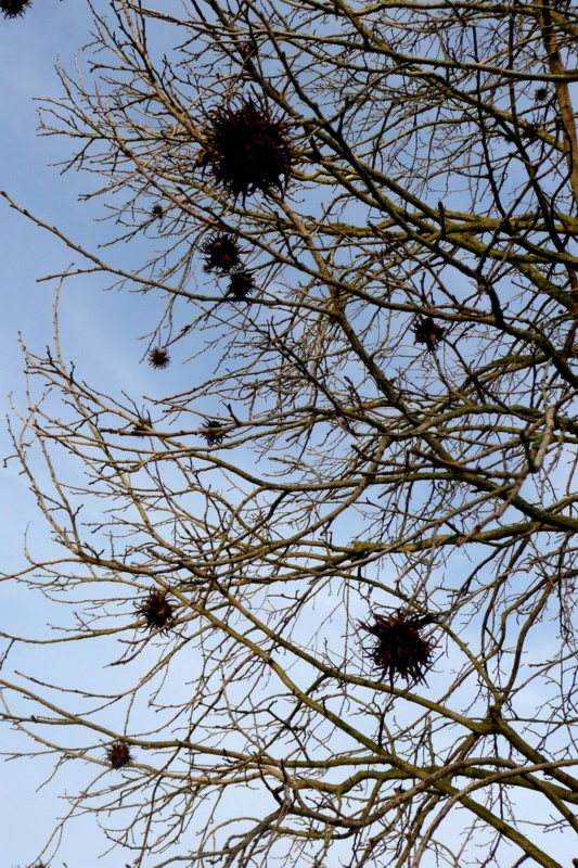 An sien Telgen hüngen düster utsehend stickelig Kugeln.