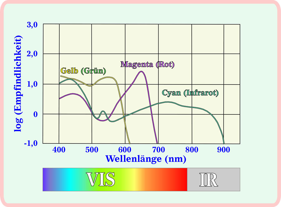 IR-sensible Laoge. För dei annern Lechtfarven giff et, so as bi'n Farvfilm,