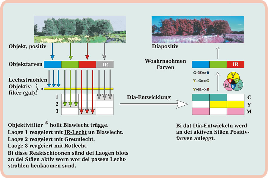 up dei Symbollieste Dei Farven werd einfach ümmesettet (süh Afbild 4), so dat dor, wor dat IR-Lecht den Film aktiveert hett, Rot tau seihn is. Dor, wor greunet Lecht warket hett, süht man nu Blaw un wor Rot upkaomen is süht man Greun. Dat Verkloarn van dat Subtraktive Farvmischken steiht all in den Bidrag äöver dei Farvfotograofie. So, nu is kloar, worümme disse IR-Filme uk Falschkfarvenfilme heiten daut. Et sünd jao uk kiene Farven mehr up ehre normaolen Stäe. Dat is dei Pries dorför, dat man nu IR-Farvbiller bekieken kann. Afbild