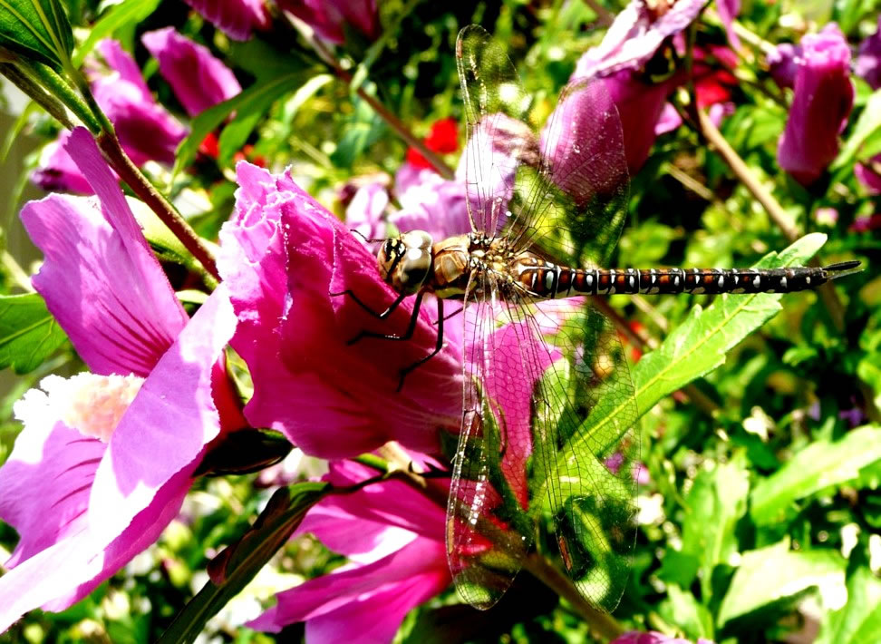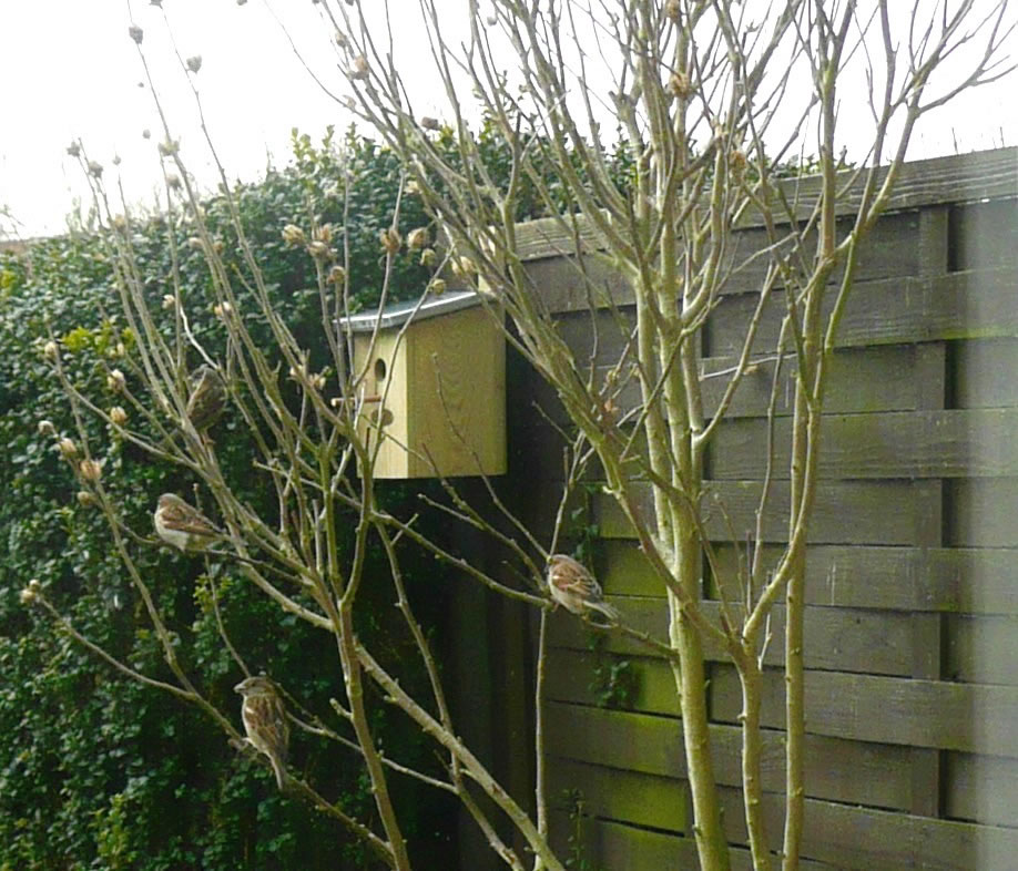 Up de Terrass tummelt sik de Vagels in dat Vagelhuus. Dor steiht an de Plank en Goornhibiskus. In den lütten Boom sett sik geern de Vagels. Vun dor fleegt se in't Vagelhuus. Dat is en Kamen un Gahn. Annerletzt kreeg ik mal mit, dat een vun de Vagels an en Samenkapsel vun den Hibiskus pickt. An den lütten Boom hängt noch vele Kapseln. De fallt eerst in't Fröhjohr af, wenn de Boom niege Bläder drifft.