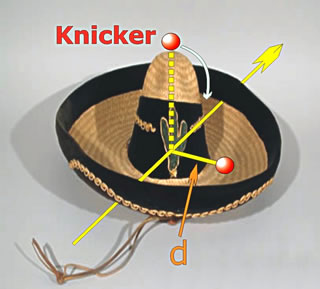 Disse orig symmetrischke Taustand geiht aover drocke twei: Dei Knicker kullert van Baoben daol un bliff up eine wisse Stäe in dei Krempen liggen. Wenn Haut un Krempen perfekt rotatschionssymmetrischk sünd, is datn echten Taufall, of dei Knicker upn End rechts, lünks, achtern of vörne ligg. Dorup kump et uk nich an, blots dorup, dat dei Knicker eine Richtung wiest un so dei Symmerie flüsch geiht, wo doch eiers aale Richtungen den süftigen Rang hebbet. Dor sägg man denn spontaonet Symmetriebräken tau. För us is blots dei asymmetrischke Taustand tau seihn. Wo dei woahre Symmetrie dei Mexikaonerhaut utsüht, dat wätet wi nich.