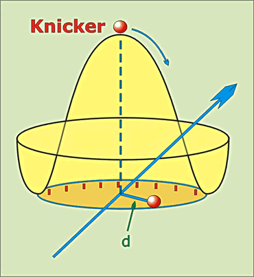 Dei Masse un dat Higgs Nu kunn man jao gägenhollen, herrje, wotau eiers eine Symmetrie inbawen (dei runde Haut) un denn mit den Knicker wedder Kott maoken, denn kunn man dei Symmetrie doch wägelaoten. Aover denn brek dat heele Modell tausaome! Uk eine spontaon braoken Symmetrie is noch eine Symmetrie, un dat et eine Symmetrie giff is afsolut läbensnödig för dei Theorie. Un dormit sünd wie all bi dei Massen van dei Deilkes. Man kunn nu taun Bispill Elektronen direkt as Deilken mit eine wisse Masse in dei Theorie inbawen. So geiht aover woahrhaft dei Symmetrie heel inn Dutt. Dor kam vörwegkaomen, wem dei Masse van disse Deilkes an dat Higgs-Feld anbinnen deit. Wo geiht dat nu? Dei Haut in dat Bild baoben is dat Potentschiaolflach van dat Higgs-Feld. Dei Hauttimpen ligg an den Nullpunkt van dat Koordinaotensystem, wekker dat Maot un dei Richtung van dat Higgseld angiff. Dorvan hang nu wedder dei Masse van aale Deilkes af, taun Bispill van Elektronen un Quarks as eine wisse Taohl maol disse Längte.