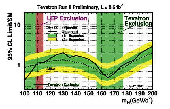 Dei experimentellen Kenndaoten van dat Higgs-Boson hanget van siene Masse af, wekke man in'n Raohmen van dat Standardmodell nich vörutseggen kann. Wenn dei Energie van einen Deilkendriever grötter werd, denn ist uk dei Masseraohmen, in den man nao dat Higgs-Boson seuken deit, grötter. För leege Massen, dat heit lüttker as 140 Gigaelektronenvolt (GeV, ein GeV is soväl as eine Milliarde Elektronenvolt), deilt sik dat in twei Photonen, twei Tau-Leptonen of in ein Poar van b-Quarks.För gröttere Massen ligg dat Leit bi dei Splitterkanäöle för ein Poar van W- of Z-Bosonen. So mutt man bi dat Seuken väle unnerscheidlike Anaolysen dörföhren, wekke denn tau ein tausaomehören Resultaot kombineert werd. An den Driever "Tevatron" an dat Fermilab werd Protonen und dei tauhören Antideilkes, dei Antiprotonen, mit eine Energie ümmer van eine Billion Elektronenvolt (ein Teraelektronenvolt, TeV) tausaomeschaoten. Dei Daoten werd van dei twei Experimente an'n Tevatron, CDF un DO, upnaohmen un unnersöcht. An'n meesten woahrschienlik is et, dat'm hier dei Produktschion van dat Higgs-Boson dör sien Upsplittern in twei W-Bosonen naowiesen kann. Dei Resultaote van dit Seuken sünd in Bild 2 as Funktschion van dei annaohmen Masse van dat Higgs-Boson graofischk dorstellt. In den Masseraohmen, in den dei schwarte, dörtrocken Linie unner den Wert van 1 loopen deit, kann dat Vörkaomen van ein Higgs-Boson, as et in dat Standardmodell vörutseggt werd, mit eine Woahrschienlikkeit van 95 Prozent utschlaoten wern. Dei van dei Experimente CDF un DO utschlaoten Masseraohmen ligg so tüschken 156 un 177 GeV as uk tüschken 100 un 109 GeV.