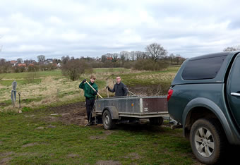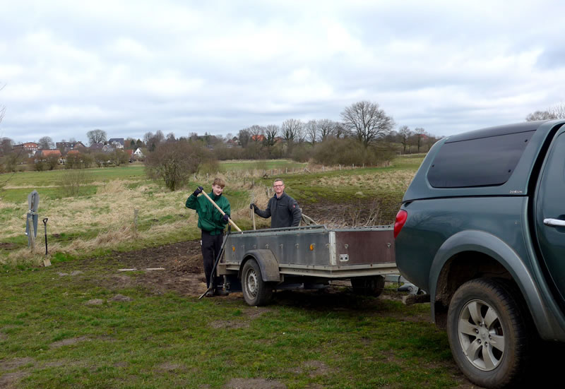 Wedder buten op den Hoff, wies de Buurfru up ehr'n Landrover: "Denn steigen Sie mal ein! Ich muss so und so unsere Felder abfahren und nach den Zäunen und den Tieren Ausschau halten! Da können sie dann das Bett der Schwartau sehen."