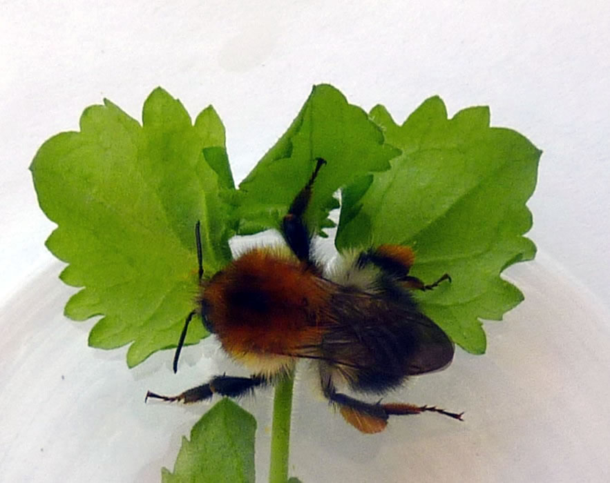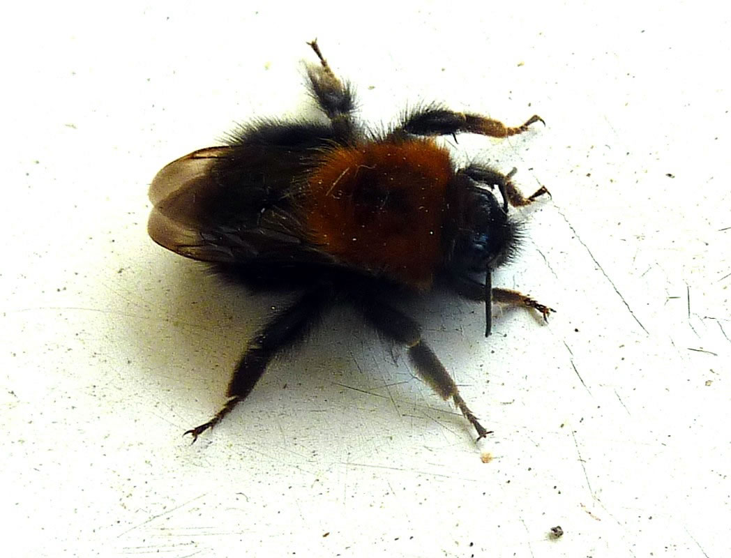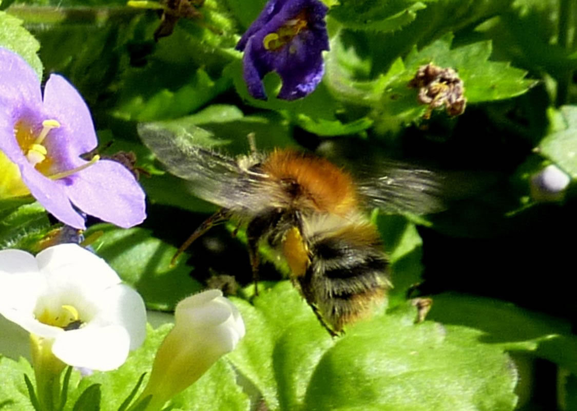 En poor Biller kunn ik maken, aver denn föhlen sik de Hummeln stöört un flögen in Tandem dorvun. Nu heff ik jeden Dag de Boomhummeln beobacht. Se weern to wiet weg un flögen ok ümmer glieks dorvun. Aver up eens vun mien Biller kunn ik en Boomhummel utmaken. Vun de Tiet an heff ik versöcht, de Boomhummel niep un nau ünner de Luup to nehmen. Erkennen kunn ik se goot an den Haarbüschel up den Kopp.