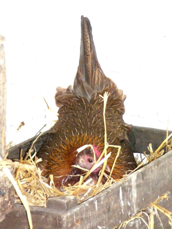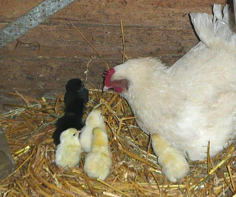 Nu müss de Gluckhehn dree Weken up de Eier sitten un se utbröden. En Schaal mit Water stünn neven dat Nest un mien Modder bröch ehr dagdääglich dat Foder. Wi Kinner dörfen nich in den Stall, denn pluster de Gluck sik up un güng up uns daal.