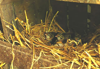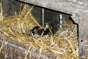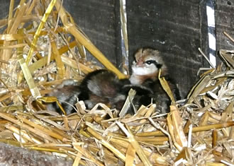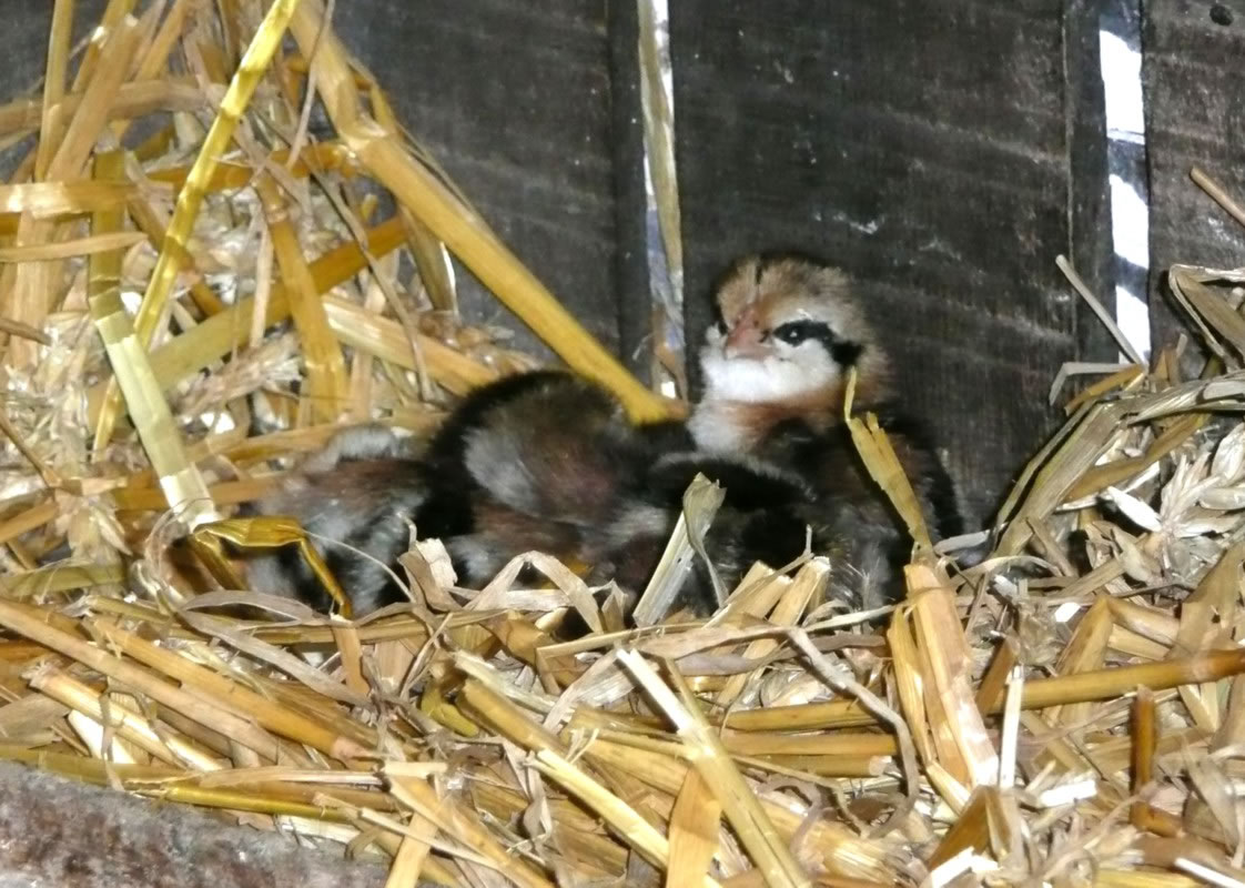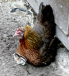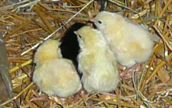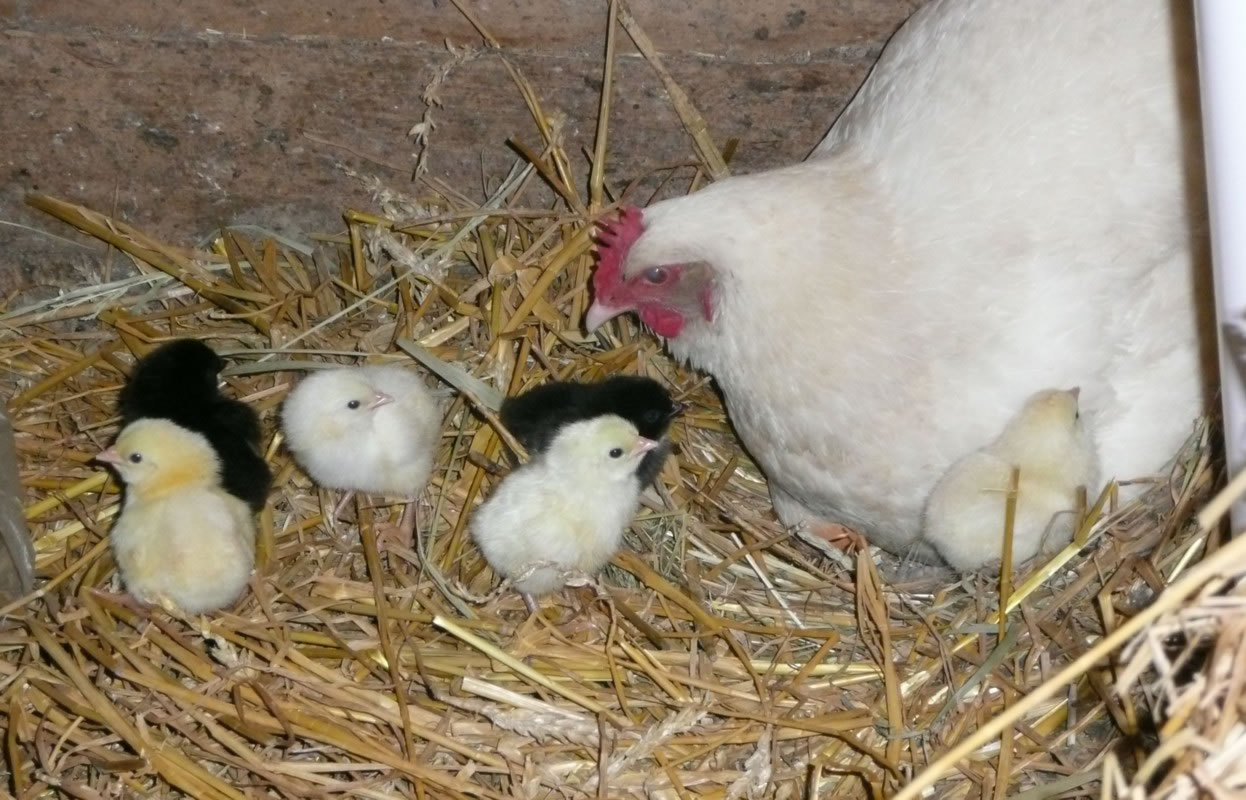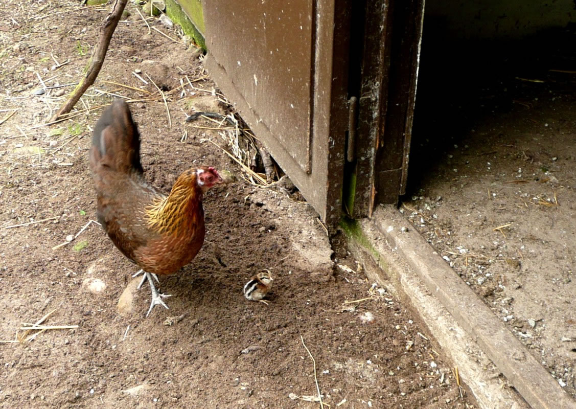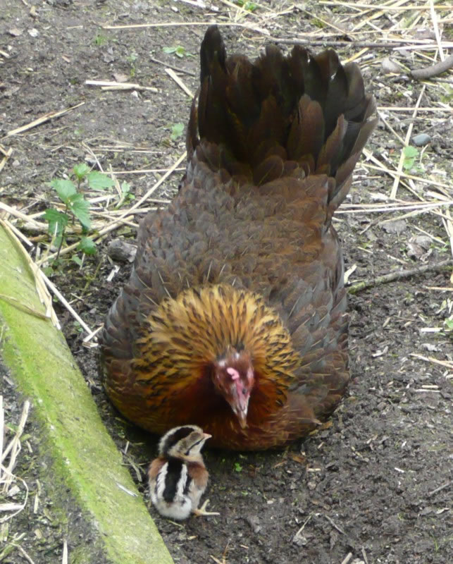 Ik kunn gor nich de Tiet aftöven, bit dor lütte Küken ut de Eier kemen. Ümmer wedder fraag ik mien Modder. Een Dag weer dat endlich sowiet. Se nehm mi an de Hand un wi güngen tohoop in den Stall. Dor keem en lütten Kopp ünner de Feddern vun de Gluck to'n Vörschien. "Piep, piep" kunnen wi höörn. Wi dörfen aver nich so neeg an dat Nest kamen, denn pluster de Gluck sik wedder up un weer böös upreegt. Se harr Bang üm ehr Kinner un wull uns verjagen.
