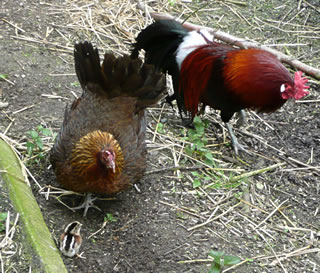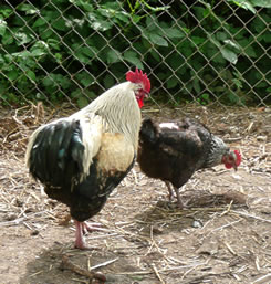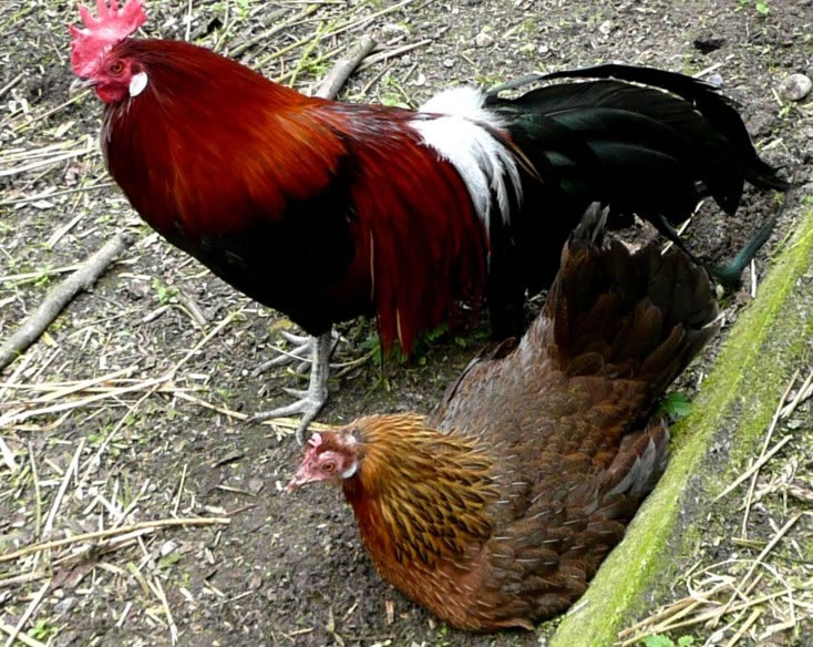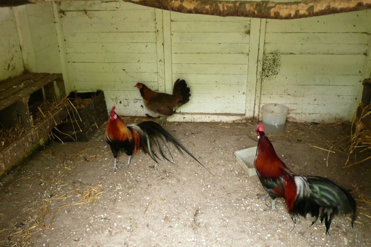 Twee Hahnen un een Hehn in'n Stall