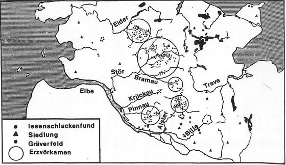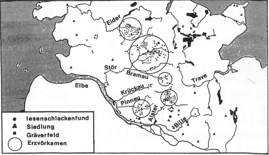 De Lüüd mutt dat düttohalven dunn as 'n recht Wunnerwark vörkamen sien, as Handwarkers ut'n Süüden jüm 500 Johrn later wiesen kunnen, woans een ut iesenhollige Glimmersteen bi hooge Tempratuurn richtig hardes Metall maken kunn, wat du in'n glöhnigen Tostand to bannig scharpe Wapen smeden kunnst. De kregen bi den ringsten Slag nicht glieks 'n Schart, de een laterhen uttowetzen harr! Bito kunn een dat nödige Erz för de Iesenverhüttung anners as bi dat Kopper 'n halven Meter ünner de Eer in de egen Lannen vörfinnen. So liggt de Fundsteden vun düssen Erzafbu all an de Westscheed vun den holsteenschen "Mittleren Landrücken", neem dat Water in Iestieden ut de Sanders in't platte Land rinlopen dee. De Waterlööp sünd hüüt noch de Quellbeeken vun uns Auen un Flüss.