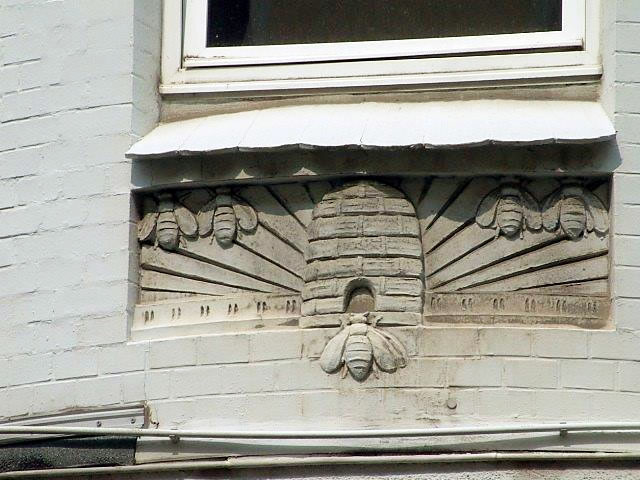Relief an en Huuswand. Sehn in Flensborg. Ähnliches heff ik in Ägypten an Sülen in Tempel sehn. De Ägypter hebbt de Immen bannig verehrt.