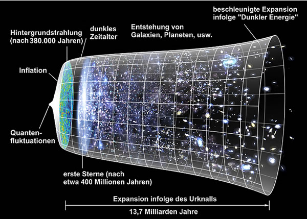 De "Biller", de düsse Instrumenten opnehmt, warrt natüürlich för uns Minschen in sichtbore Wellnlängden "översett". Trüch in de Tied? Siet sien Kinnerdaag dehnt sik dat Universum, de Weltruum, ut. All gröttere Delen, so schient dat dordörch, entfeernt sik vunenanner (dat Tempo nimmt sogor to, wat en groot Radel is). Togliek sendt de Objekte Licht un Strahlung ut. Man düt Licht zuckelt ja bloots mit de Lichtgeswinnigkeit dör't All. Bloots? Sünd 299 792 km pro Sekunn (!) minn?! Naja, en Blixer an de Straat wöör dor al blixen, avers wenn een de Dimenschoonen vun't All vör sik hett, is dat nich allto fix. Dat intressante Video op düsse Siet wiest, wo aasig eelennig dröhnig düt Tempo is. Acht Minuten! Acht Minuten alleen vun de sünn bet na de Eer! Ja un dat heet, wenn dat Sünnlicht bi uns ankümmt, is dat vör acht Minuten bi de Sünn start't. Wi seht ehr acht Minuten later. Wi kiekt also üm acht Minuten in de Tied torüch, wenn wi de Sünn opgahn seht! Wi seggt dorto: De Sünn is acht Lichtminuten wied vun uns weg. En Lichtminuut, en Lichtjohr usw. sünd Längdenangaven, liekso as "en Autostünn" orr "fief Footminuten". Kieken heet also jümmers ok: in de Tied torüchkieken. Üm Minuten, Sekunnen (wenn wi t.B. den Maand opgahn seht, de en poor Lichtsekunnen vun uns weg is), üm Nano- orr Femtosekunnen (bi Objekte, de nehgbi sünd) orr üm Johren (bi Objekte, de Lichtjohren wied weg sünd) orr Johrmillioonen un -milliarden.