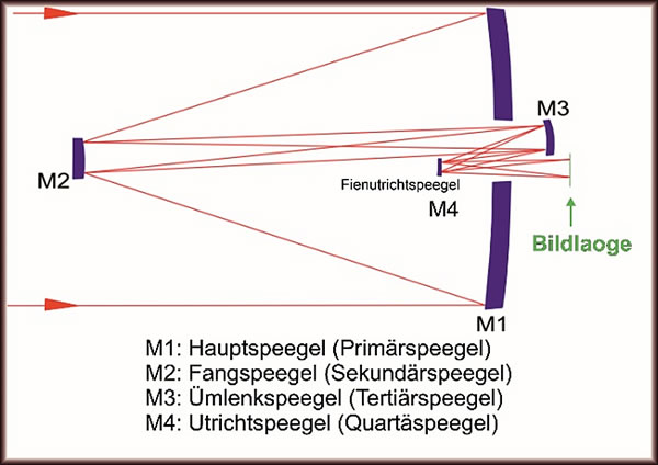 Dei licht böögte (konkav parabolischke) Hauptspeegel reflekteiert einen fokusseierten Lechtstraohl up den runden Fangspeegel. Dei Fangspeegel is nao buten hen böögt (konvex hyperplischk), un dei reflekteiert einen noch fokusseierten Lechtstraohl nao unnen dör dei Midde van den Hauptspeegel. Bi Draokenoge sitt dit AOS (Aft Optics Subsystem) in dei Midde van den Hauptspeegel. Dor binnen sünd dei Tertiär- un dei Fienutrichtspeegel, dei dat Lecht wieder fokusseiert un up dei Wätenschkup-Instrumente leitet. Dei Tertiärspeegel minimeiert uck noch dei optischken Aberrationen.