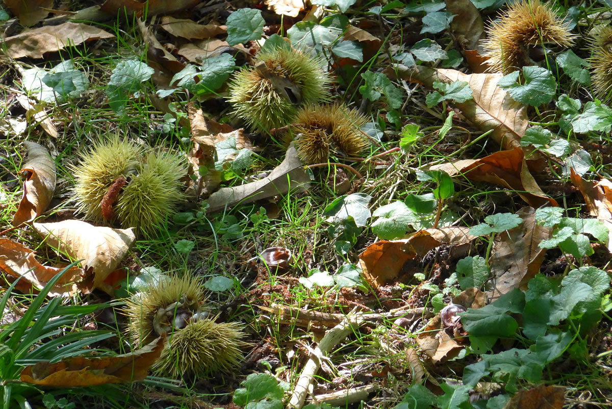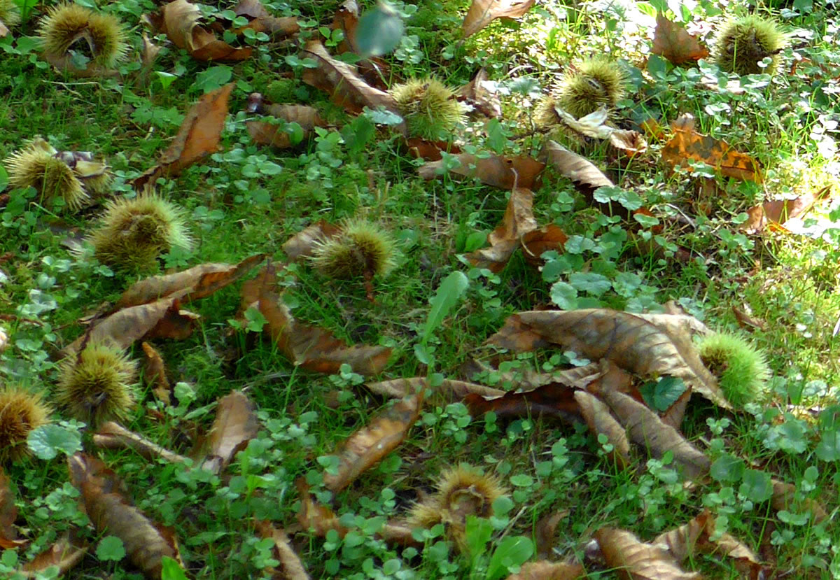Hier brukte ik blots togriepen, so veel Kastangeln legen ünner de Bööm. Aver mank al de Kastangeln leeg dor noch wat anners. Dat weern ja echte Kastangeln, Eetkastangeln! De harr ik lang nich sehn. Ünner den echten Kastangelboom legen dicht an dicht stickelige echte Kastangeln noch in de Hüll in dat Gras. De sehgen recht drollig meist kuschelig ut. Aver faat mal en an: Du lettst se glieks wedder fallen.