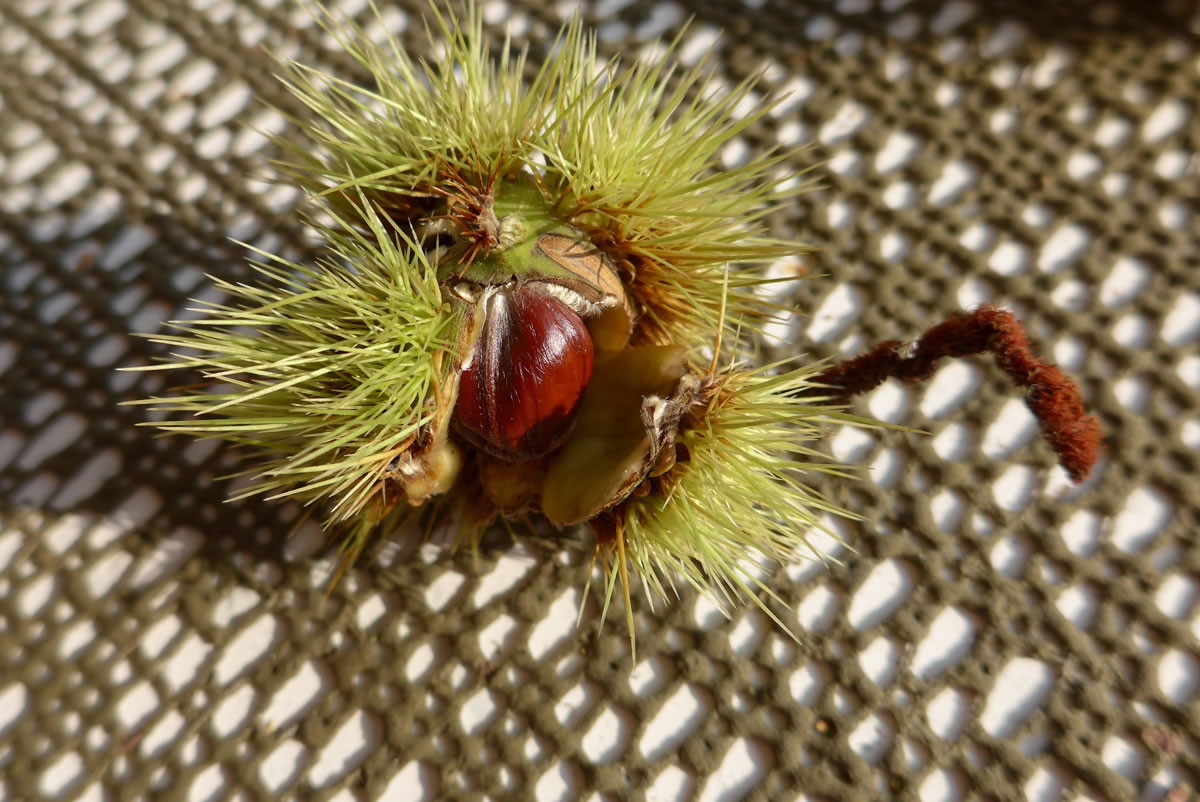 Up de Straat liegt veel breet peddte un breet föhrte Kastangeln. Welk vun de Kastangeln liegt noch mit de hellgröön Schutzhüll up de Eer. Dicke Stickeln sünd an de Hüll. Mit de Tiet platzt de Schutzhüll. Ut en lütte Ritz kiekt denn al de dicke goldbrune Kastangel.