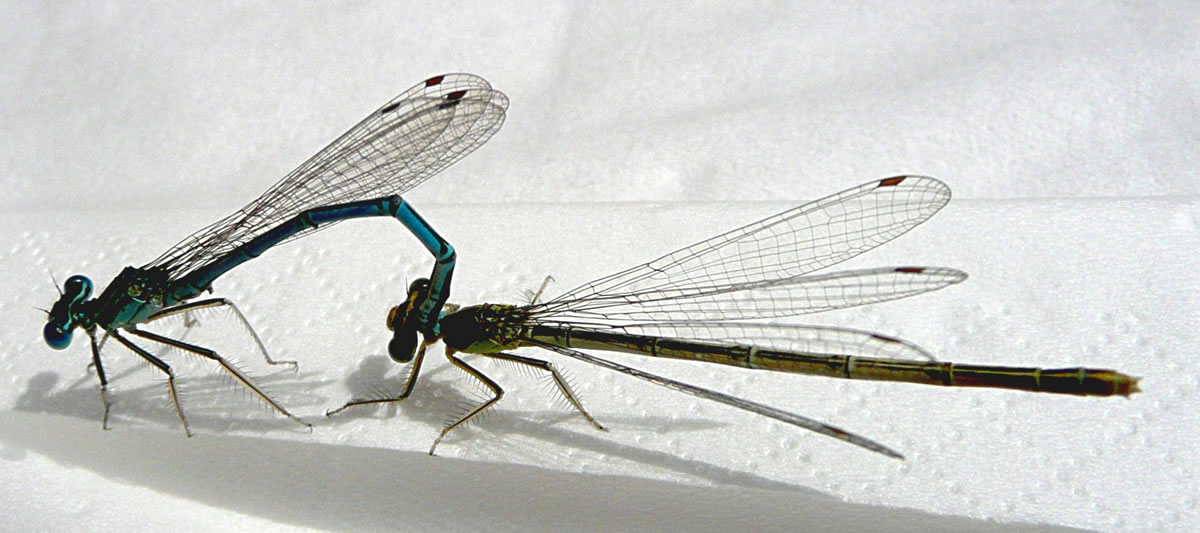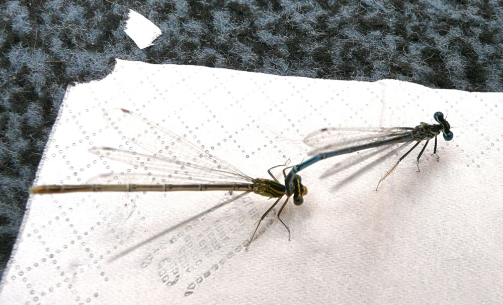 So wiet weer dat bi uns' Poor noch nich. Man "ümarmt" höllen se sik al, un dor seten se un leten sik nich stören; se harrn allens üm sik rüm vergeten, dat maakt de Leev. Ik güng in de Knee, üm se to knipsen. Aver so geev dat keen goot Bild af. Dor keem mien Mann mi mit en Tempotaschendook to Hölp. Beid hockten wi nu up den Footbodden vun dat Schipp. Ganz vörsichtig hebbt wi de Libellen up dat Dook bugsiert. Jümmers noch leten se sik nich stören!