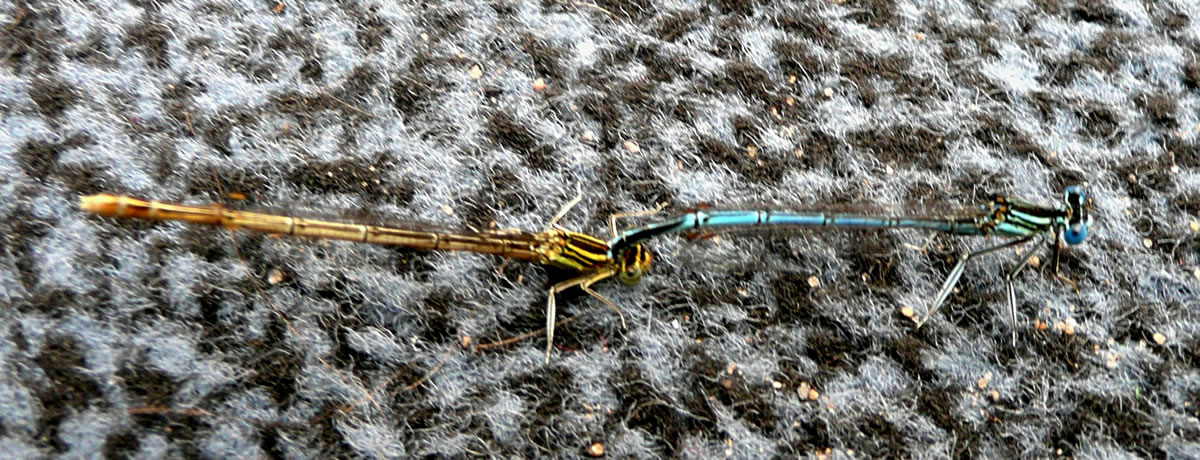 Torüch kaamt Se denn mit'n Zurück-Knoop vun den Browser. De eerst Fohrt up den "Amazonas des Nordens", de Wakenitz, hett uns so goot gefullen, dat wi al wedder up den Wakenitzdamper na Rotenhusen ünnerwegens weern. Un wedder weern Swattfohrer an Bord! Dittmal weern se up de Hochtietsreis. Blaue Federlibelln weern dat, de kannst faken an't Water drapen, sünnerlich wenn dat en reines, ruhiges Water is dor sünd se tohuus. Se wullen ehr Hochtiet an Bord fiern! De Libellen kemen glieks in Tandem anflagen. He weer blaag as Mannslüüd dat ja oftins op Hochtieden sünd, ok bi uns Minschen; avers de Libellerich vun düsse Oort is alltiet blaag, nich blots bi de Hochtiet. Un dat is en schönes, lüchen Blaag. De Bruut weer hellbruun, so seht de Fruuns bi de Blaue Federlibelle ut, vun Kind an. Vörn up dat Lief un an'n Kopp harr uns Libelle schöne Striepen in depes Düüsterbruun un Ocker, meist as en Tigerin. Dat weer en wunnerschöne, rassige Bruut!
