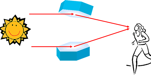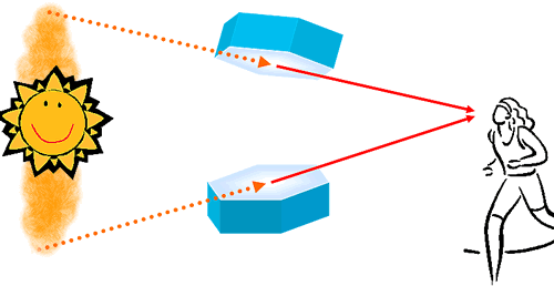 Dat Licht vun de deep stahn Sünn kümmt ok meist waagrecht. Fallt dat op de Stiernfront vun so en Iesschiev, denn warrt dat in en flachen Winkel trüchstrahlt. Man mehrst variiert de Winkel beten, wieldat de Schiev ja rümwibbelt. Un dordör kümmt ok de Indruck tostann, dat dat Licht en Pieler is: De bövelste Sünnstrahl in dat Bild rechterhand kümmt schienbor vun wieder baven (Pieler na baven). De neddere Sünnstrahl kümmt schienbor vun wieder nerrn (ünnere Pieler). Je stärker de Kristalle kippelt, je länger kann de Pieler schienen!