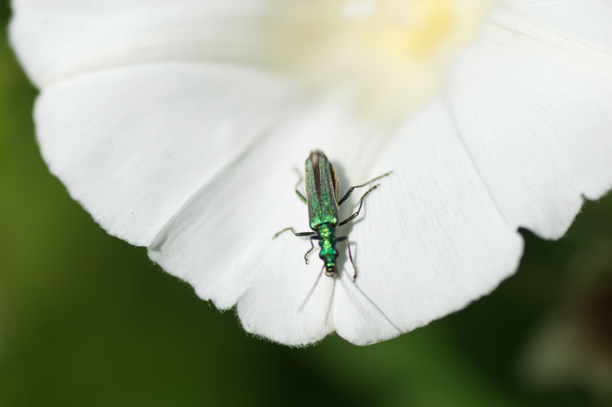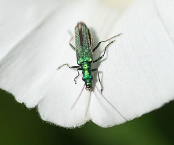 De wunnerschöne Käver is teemlich lütt, man bloots en goden Zentimeter, un lücht je na dat Licht mal gröön-metallic, mal mehr so oliv-güllen-klöörig. De Flüchten deckt dat Lief nich ganz, so dat de brune Moors achtern rutkiekt. Uns Fotomodell hier is en Wievken; dat Heken hett an sien Achterbeen noch so extra "Muskelpaketen" as'n Bodybuilder, as glänzen Parlen seht de ut — keen Wunner, dat de Fruuns dat sexy findt; sünst seht de Geslechter sik liek. Dat smucke Deert fritt Pollen, allens, wat dat finnen kann, geern vun uns Goornblomen. Un warm mag de Käver dat ok. Veel wieder nöördlich as bi uns kümmt he (noch) nich vör; an'n mehrsten leevt he in Süden Europa.