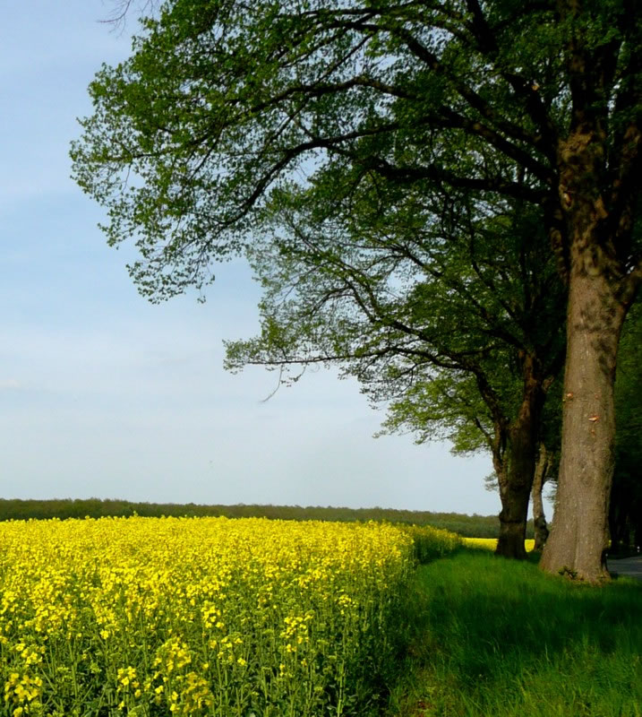 maken", pransel ik mien Mann an. "Hess al wedder keen Gau pack ik noch en poor Saken för de Fohrt un af güng dat in de Richt vun den Schaalsee, na Neukirchen. Kott achter Lübeck lüchen rechts un links de eersten gelen Rapsslääg. An den Stratenrand un up de Wischen blöhn Bottersteker un lüchen mit den Raps üm de Wett. De Welt weer in Geel dükert. Na 'n Stunnstiet langen wi in den Gasthof an'n See an. Buten in den Goorn funnen wi enen frien Disch.