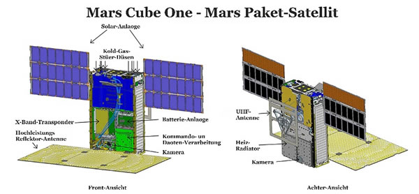 Dit Twillings-Kommunikationsrelais, dat dat Nasa Jet Propulsion Laboratory in Pasadena, Kalifornien, bawde is ein Technologie-Utprobeiern mit den Naomen Cube one (MarCO). Disse lüttken Paket-Satelliten sünd eine Ruum-Fohrtüg-Klasse för sick mit eine lüttke Standard-Grötte un mit eine Standard-Modultechnik. Universitätsstudenten bawden deils disse Module. Eine heele Riege van disse lüttken Ruum-Sonden kunnen mit annere Raketen, dei noch'n bäten Platz äöwer harrn, in den Weltruum utprobeiert wern.